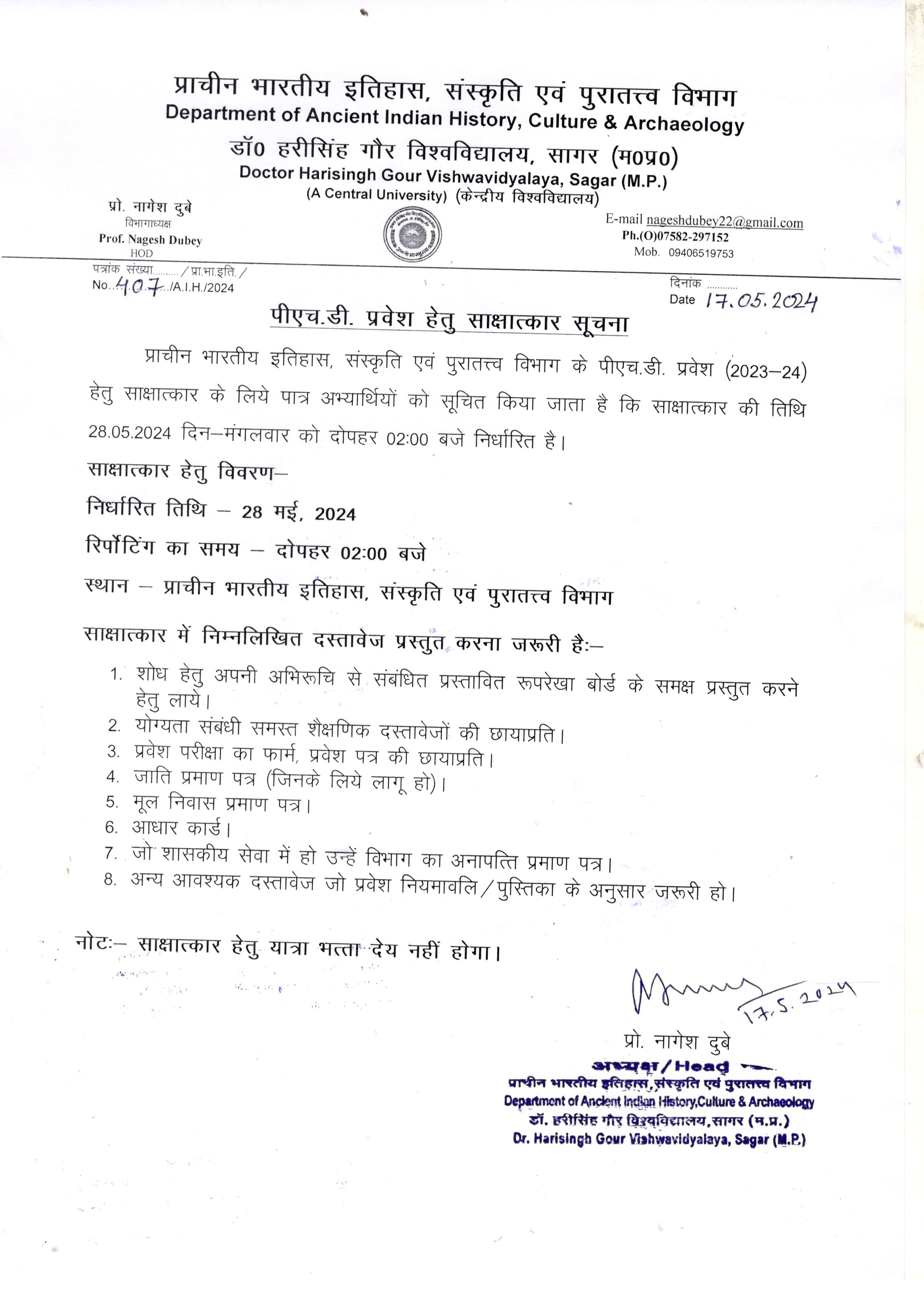 - सूचनाः पी.एच.डी. साक्षात्कार 2023-24 “Dept. Ancient Indian History, Culture & Archaeology” (DispNo.407, Dt.17/20-05-2024) पूर्ण जानकारी हेतु संलग्नक देखे