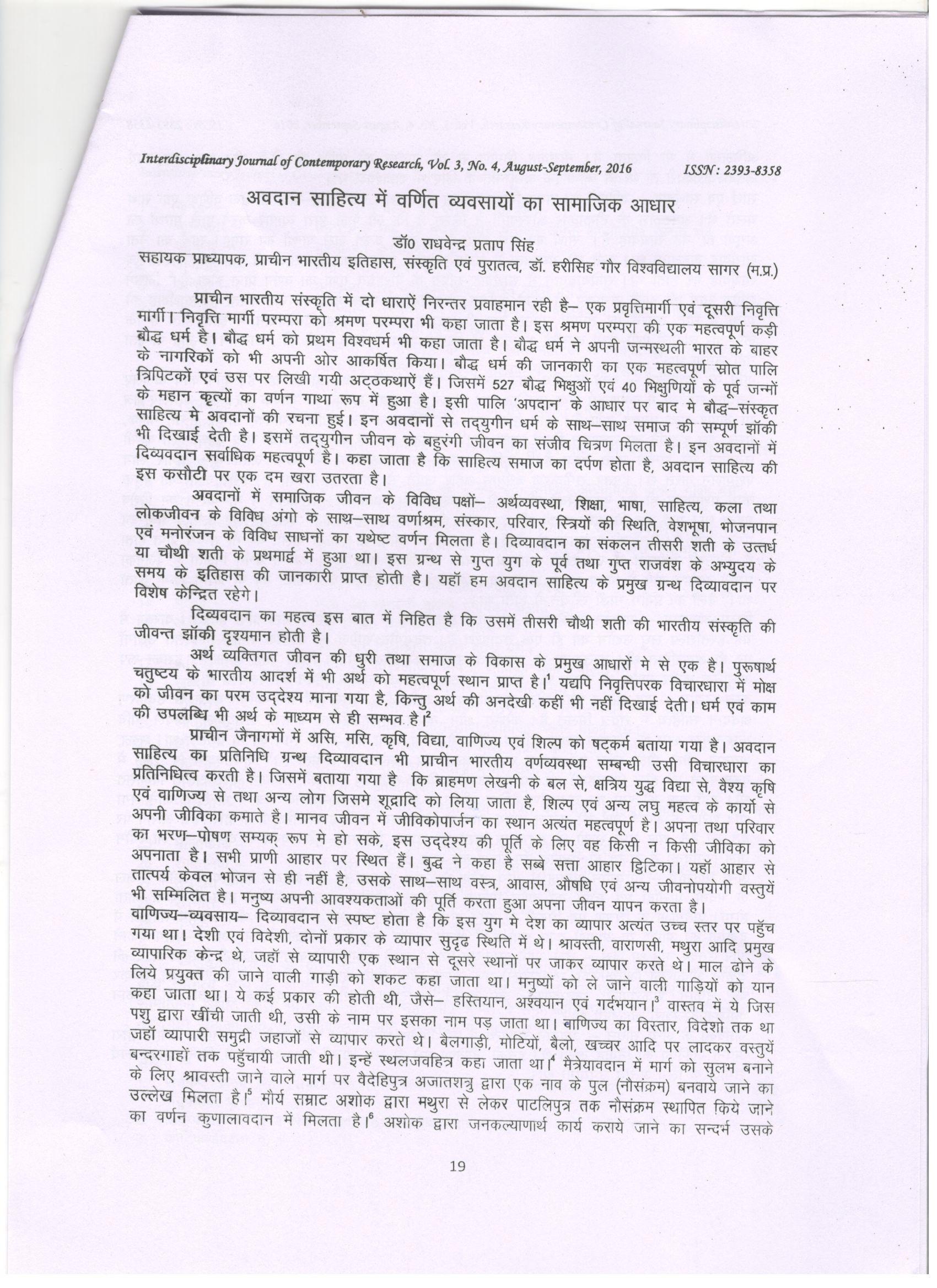 34 | Dr. Raghvendra Pratap Singh | Interdisciplinary Journal of contemporary research : An International Research | Avadan Sahitya mein Varnit Vyavasayon Ka Samajik Adhar, | 2016 | Download |