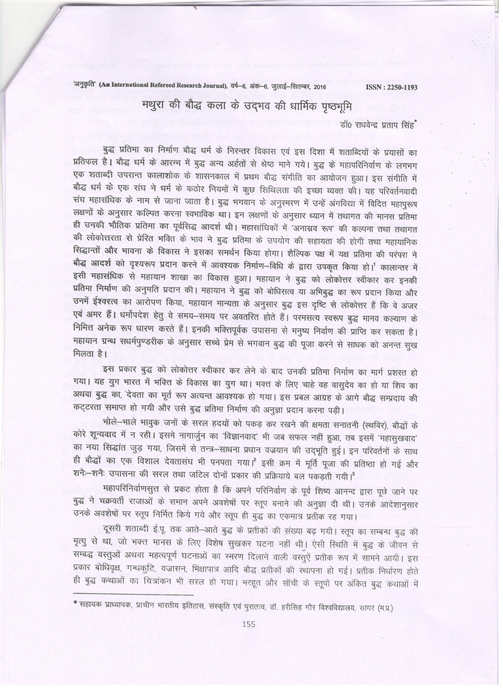 33 | Dr. Raghvendra Pratap Singh | Mathura Ke Bauddha Kala Ke Udbhav Ki Dharmik Pristhbhumi, Anukriti | 2016 | Download | |
