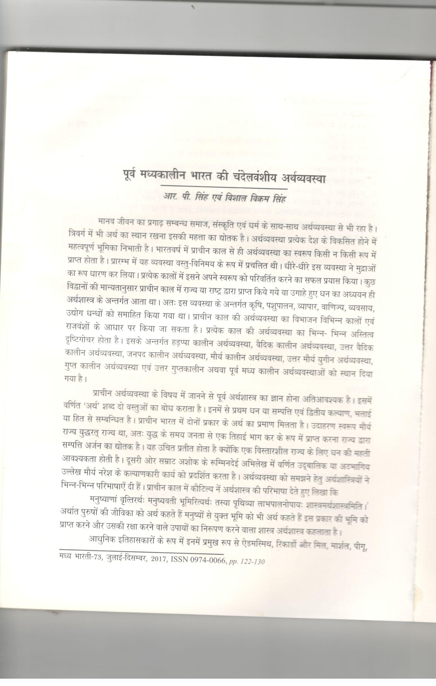 20 | Dr. Raghvendra Pratap Singh | Madhya bharti | Purva Madhyakalin Bharat Mein Chandela Vanshiya Arth vyawastha | 2017 | Download |