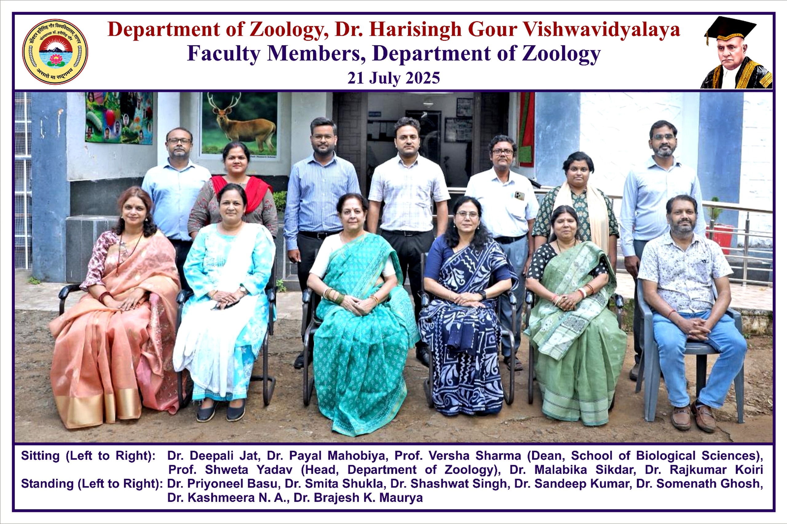 The Department of Zoology is one of the pioneer departments of the university. It started with the establishment of the university itself on July 18, 1946. The founder Vice Chancellor, Dr. Harisingh Gour, invited Dr. D. S. Shrivastava from Agra University to start the department. He was a Reader and Head until 1951, when he left for Belfast (UK) for research work. Dr. Panna Lal Mishra from Lucknow joined the department as Reader and Head (1951–1953). Dr. D. S. Shrivastava came back in 1953, took over as Professor and Head in 1955 and continued until his retirement in 1968. Prof. Har Swaroop joined the department as a lecturer in 1947, he left the department in 1960 and joined Vikram University, Ujjain (M.P.), as Professor and Head, later he became Vice Chancellor of Jiwaji University, Gwalior (M.P.). Prof. H. N. Bhargava joined the department in 1948, he retired in 1985. Prof. R. S. Saini joined the department in 1949 and retired in 1985. Dr. S. D. Mishra joined the department in 1951, later in 1967 he left and joined Jodhpur University, Rajasthan. Prof. R. K. Shrivastava was the first M. Sc. of the department joined the department in 1949, he retired in 1988. Prof. H. K. Saxena, Dr. D. D. Soni, Dr. S. K. Tiwari, Prof. B.K. Shrivastava, Prof. Y. N. Sahay, Prof. D. P. Gupta, Prof. A. K. Raizada, Prof. S. Sahai, Prof. O. P. Gupta, Prof. Sunita Bhargava, Prof. Smita Banerjee, Dr. V. S. Bais, Prof. D. K. Saraf, Prof. U. S. Gupta, Prof. Mangla Bhide, Prof. Janak Dulari Ahi, Prof. Subodh Kumar Jain (FIAN, FNASc), have been working in the department. Presently, Prof. Versha Sharma (Dean-SBS), Prof. Shweta Yadav (HoD), Dr. Malabika Sikdar, Dr. Payal Mahobia, Dr. Deepali Jat, and Dr. Raj Kumar Koiri are working in the department as permanent faculty members.