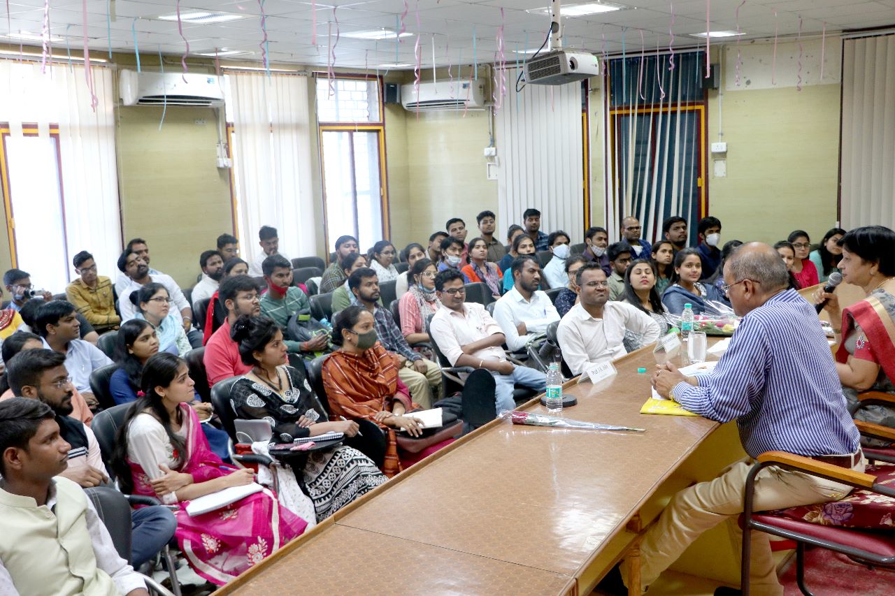 Hon'ble Vice Chancellor Prof. Neelima Gupta Ma'am and Prof. J.K. Jain, Head, Department of Commerce in an interactive session with Research Scholars of the University