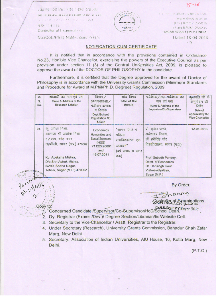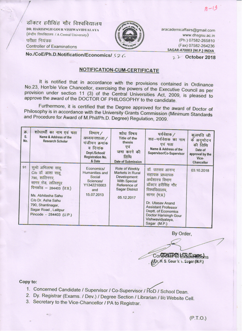4 | Abhilasha Sahu | Economics | Dr. Utasav Anand | Role of Weekly markets in rural devlopment With special reference of Sagar District | 2013-14 | 2018 | YES | 2013 | view |