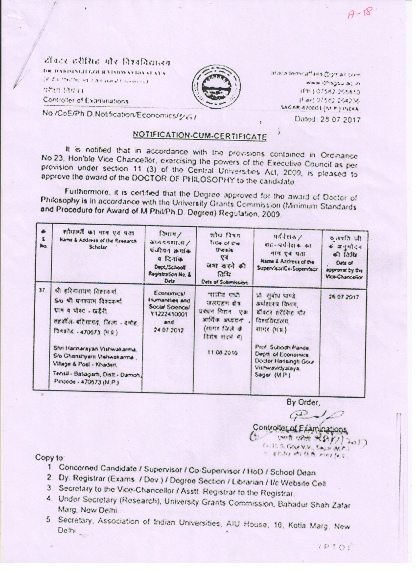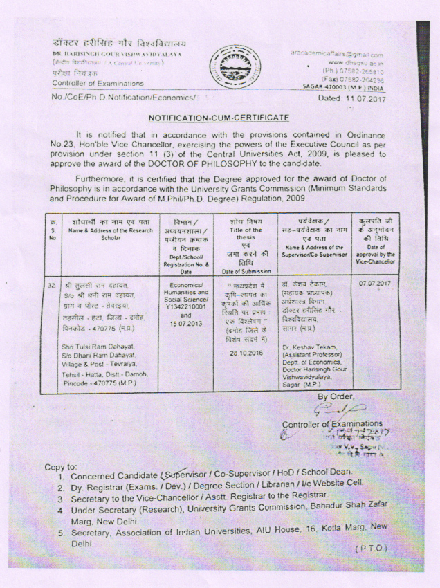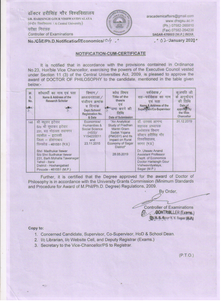 6 | Madhukar Itewar | Economics | Dr. Utasav Anand | An Analytical Study Of Pradhan Mantra Gram Sadak Yojana (PMGSY) and its Impact on Rural Economy of Sagar District | 2015-16 | 2019 | YES | 2013 | view |