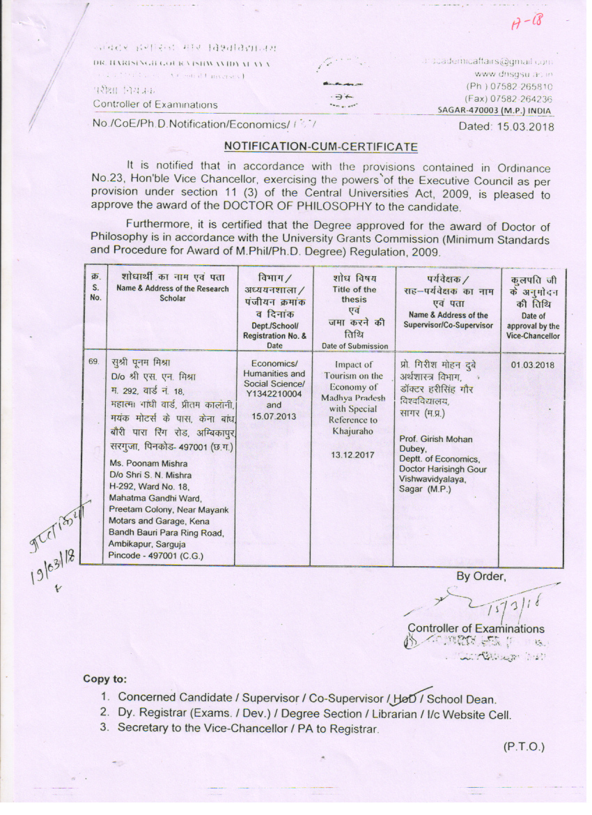 5 | Poonam Mishra | Economics | Dr. G.M. Dubey | Impect of Tourisam on the Economy of Madhya Pradesh with special reference to Khajuraho | 2013-14 | 2018 | YES | 2000 | view |