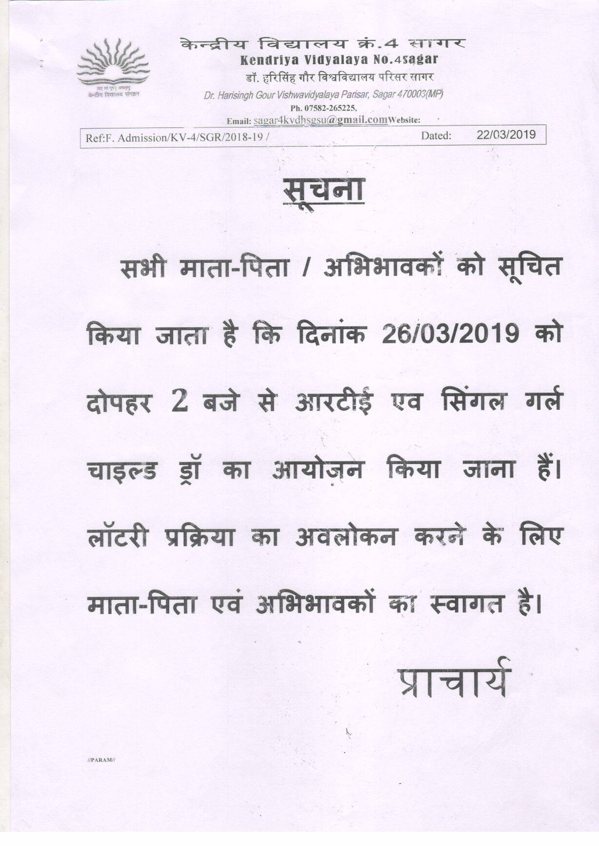 Notice for Drow of lots for RTE, SGC & other related information “Kendrya Vidyalaya -4”- (DispNo.F.Admission/kv-4/2018-19/150, Dt.22-03-2019)