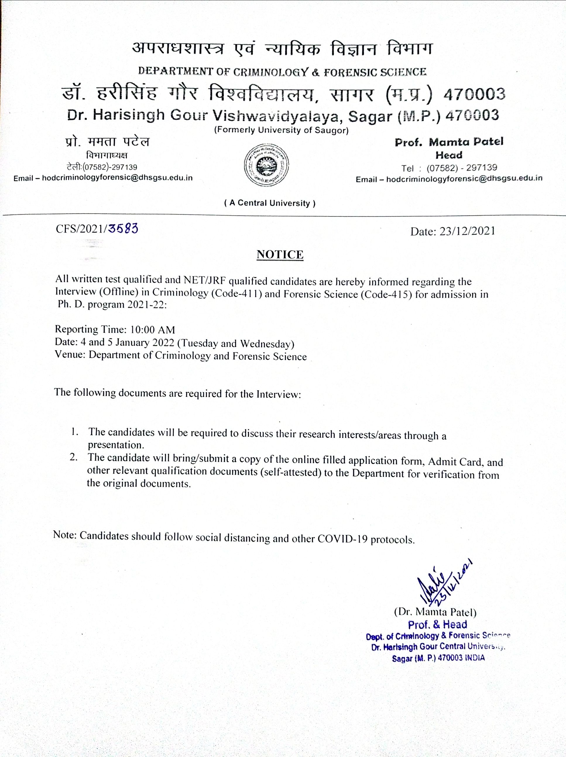 - Admission in Ph.D. Programme 2021-22 in Criminology & Forensic Science - Dept. of Criminology & F.Sc.