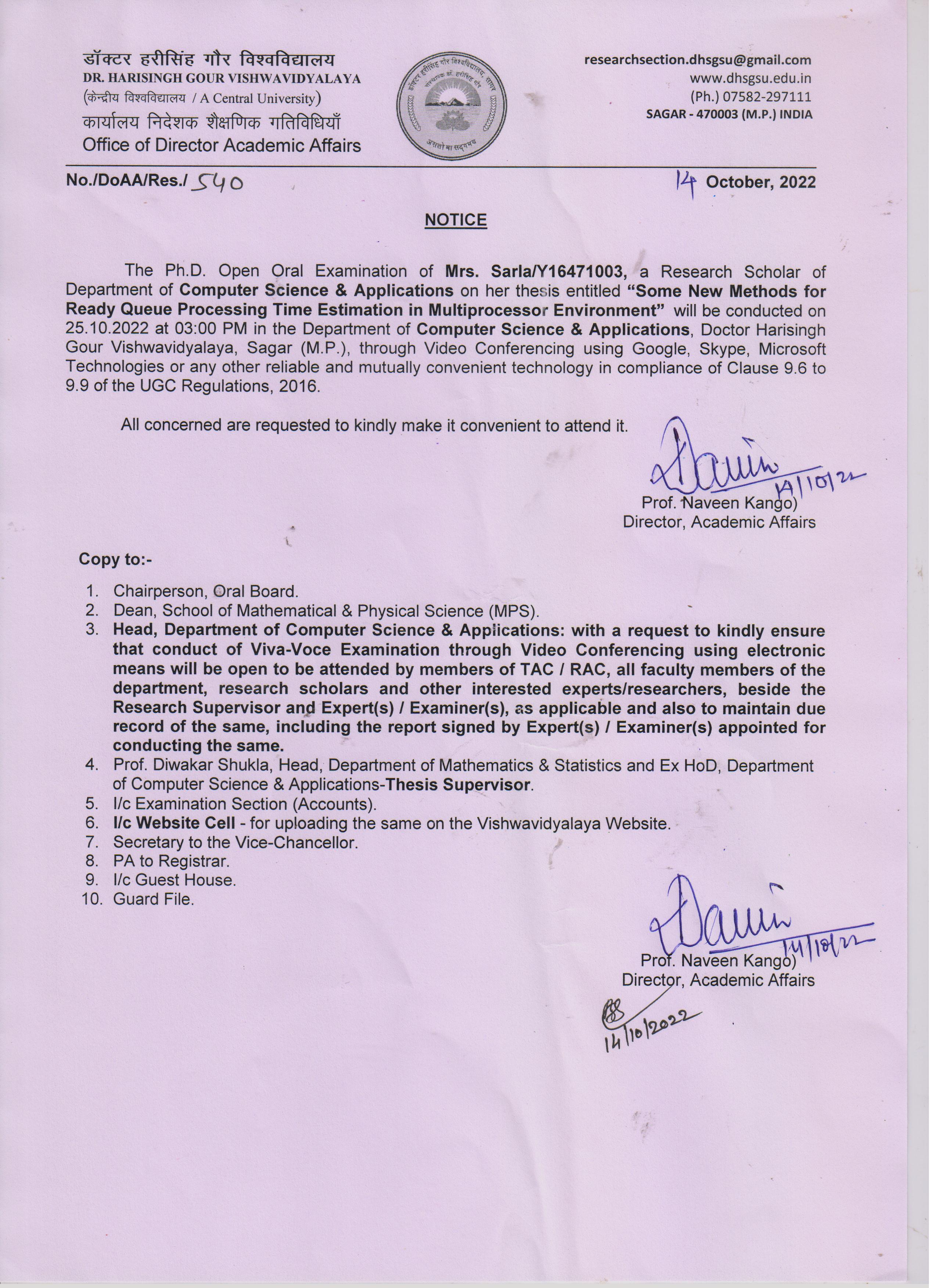 - Notice: The Ph.D. Open Oral Examination of Mrs. Sarla on 25-10-2022 Department of Computer Science & Applications “DoAA Office” -(DispNo. DoAA/Res./540,Dt.14/17-10-22) पूर्ण जानकारी हेतु संलग्नक देखे