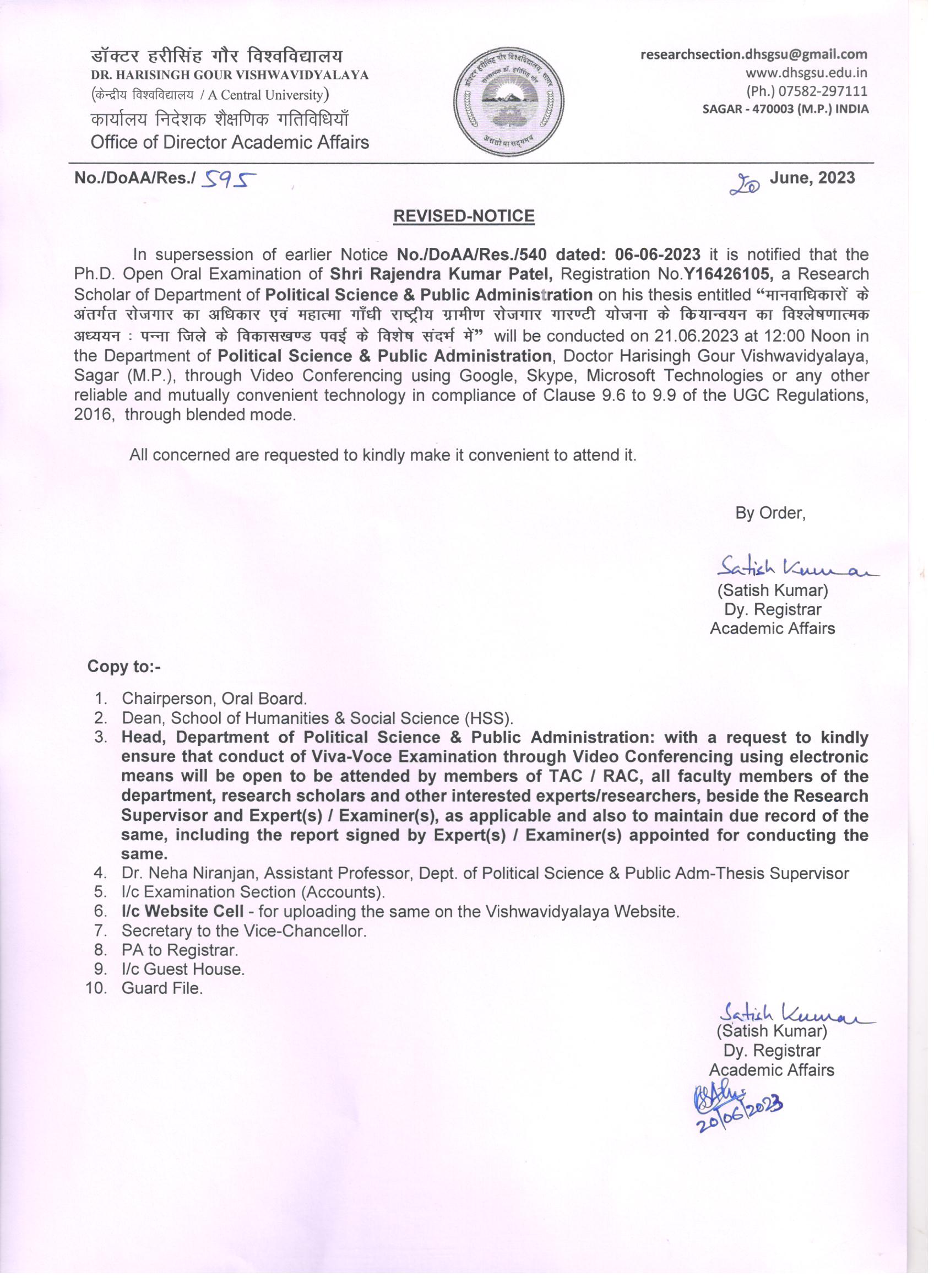 - Revised Notice: Ph.D. open oral examination of Shri Rajendra Kumar Patel on 21-06-2023 Department of Political Science & Public Administration “DoAA office” (DispNo. DoAA/Res/595, Dt.20-06-2023) पूर्ण जानकारी हेतु संलग्नक देखे