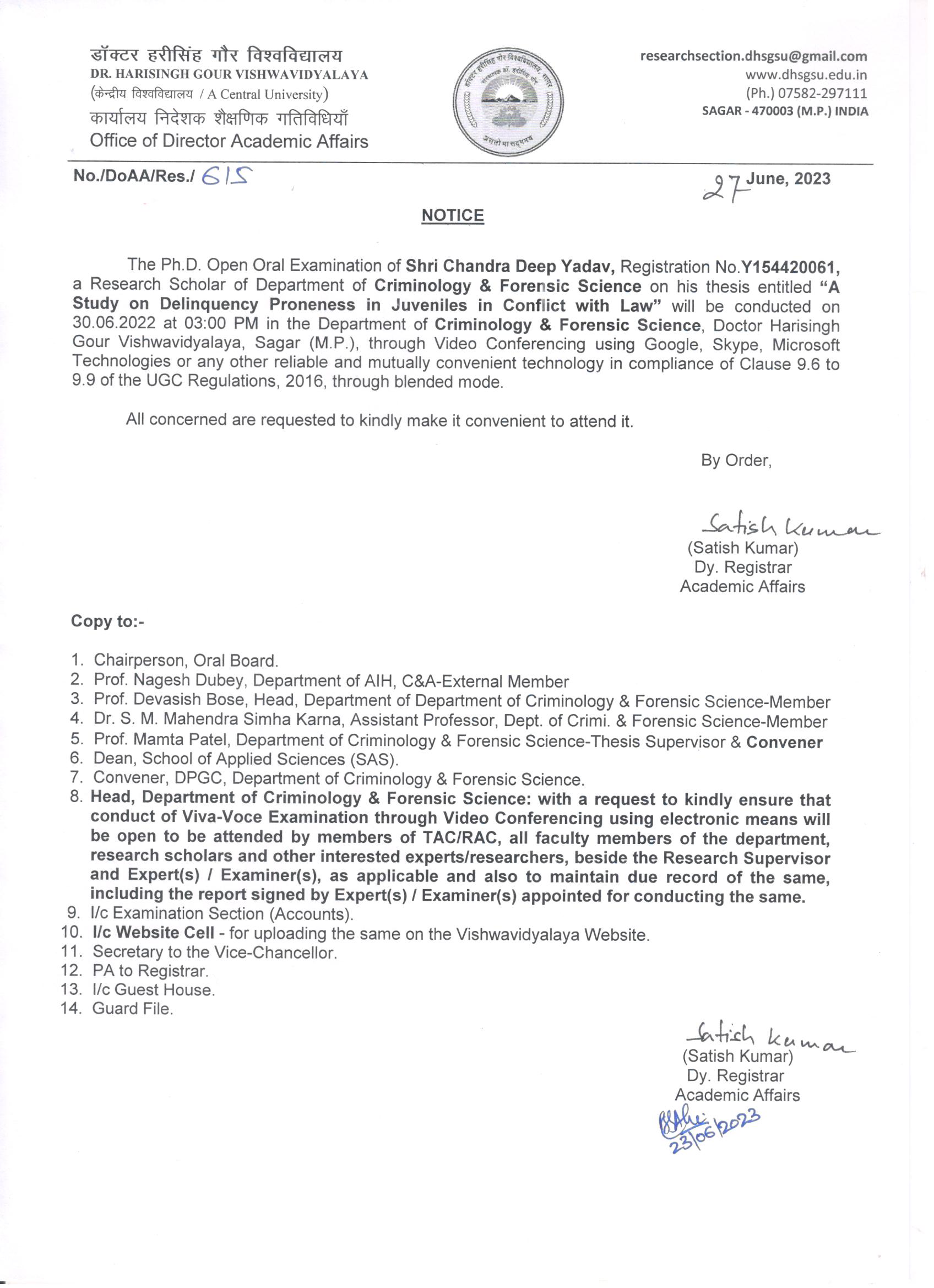 - Notice: The Ph.D. open oral Examination of shri Chandra Deep Yadav on 30-06-2023 Department of Criminology & Forensic Science “Research Section” (DispNo. DoAA/Res/615,Dt.27-06-2023) पूर्ण जानकारी हेतु संलग्नक देखे