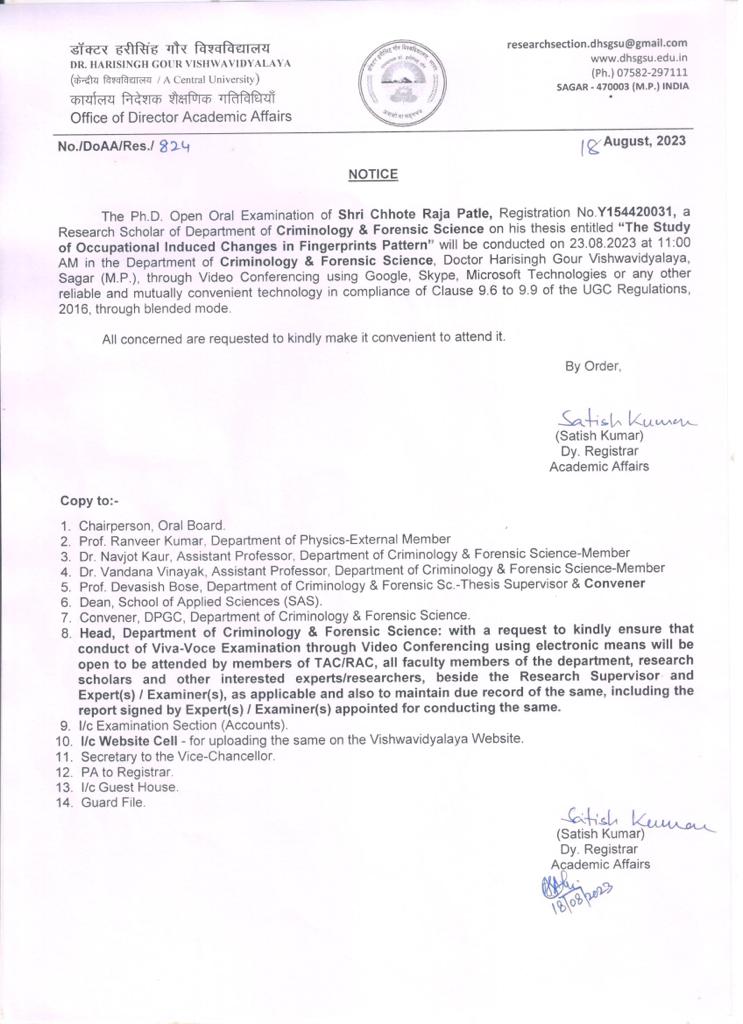 - Notice: The Open Oral Examination of shri chhote raja patle on 23-08-2023 Department of Criminology & Forensic Science “Dept. Crim.& F.Sc.” (DispNo. DoAA/Res/824,Dt 18/22--08-2023) पूर्ण जानकारी हेतु संलग्नक देखे