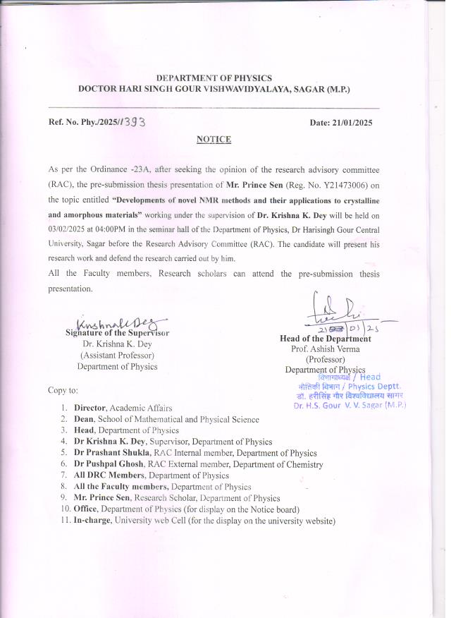 Notice: Pre-submission thesis presentation of Mr. Prince Sen, on 03-02-2025 Department of Physics “Dept. Physics” (DispNo. phy./1393, Dt.21-01-2025) पूर्ण जानकारी हेतु संलग्नक देखे