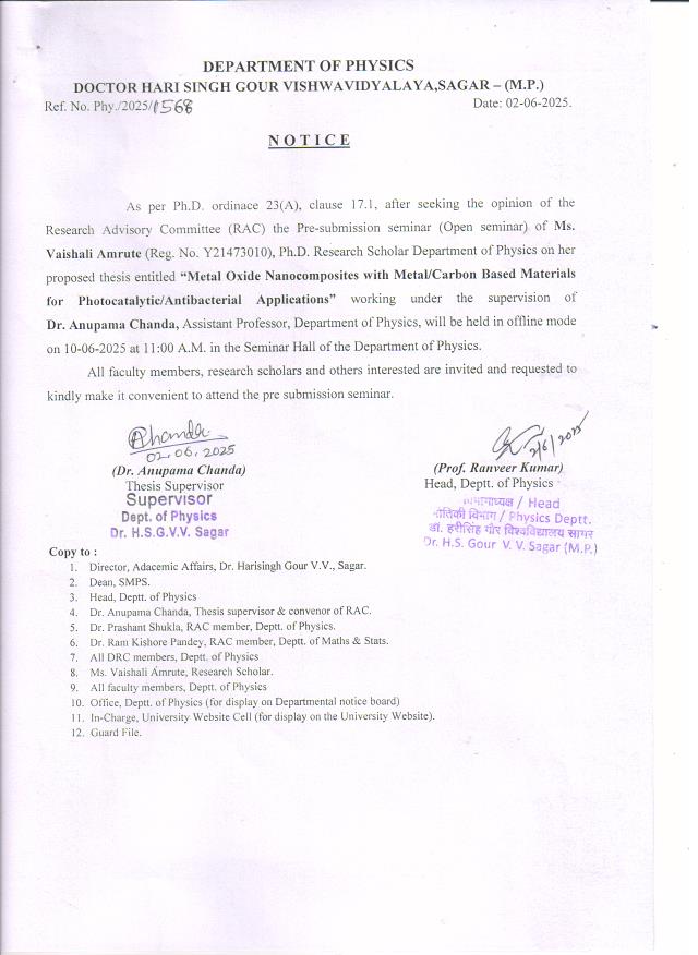 Notice: Pre-Submission seminar of Ms. Vaishali Amrute on 10-06-2025 Department of Physic "Dept. Physic" "Disp.No.--/1568,Dt.02-06-2025" पूर्ण जानकारी हेतु संलग्नक देखे