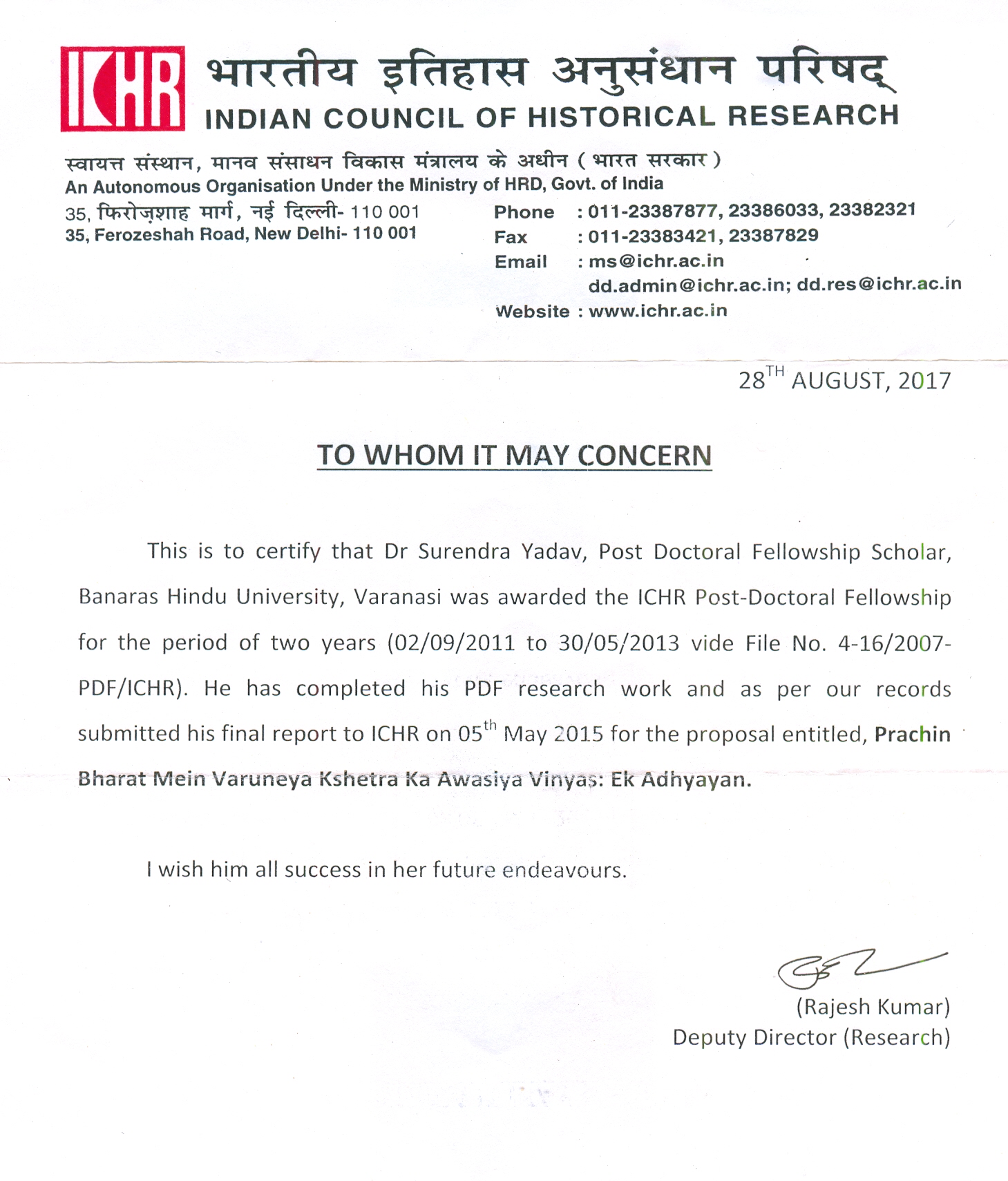 2017 | Dr. S.K. Yadav | Post Doctoral Fellow | ICHR New Delhi | Download |