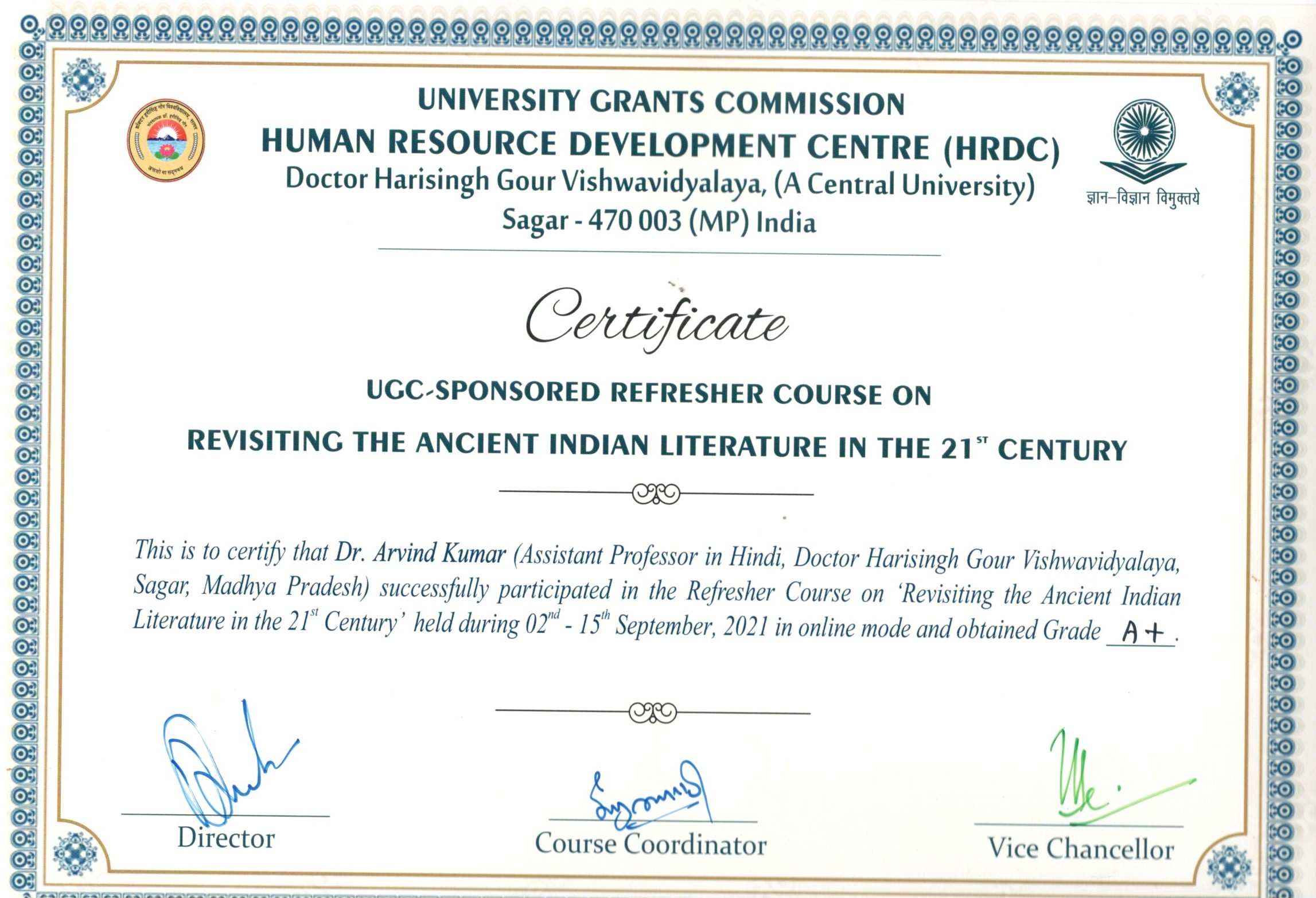2021 | Dr. Arvind Kumar | Revisiting The Ancient Indian Literature in The 21 Century (Refresher Course) |