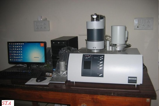 STA ( Model 449 F1 Jupiter, NETZSCH) , is combined unlimited configuration flexibility and unmatched performance in just one instrument. Simultaneous thermal analysis generally refers to the simultaneous application of Thermogravimetry (TG) and Differential Scanning Calorimetry (DSC) to one and the same sample in one instrument. The system is fully automatic one can program for 19 sample measurements from room temperature to 14000 C, in N2/O2 gas flow atmosphere, with a defined heating rate. By DSC analysis one can find out, Melting point/crystallization behavior of the material, Solid-solid transition, Polymorphism, Degree of crystallinity, Glass transitions, Cross-linking reactions, Oxidative stability, Purity determination, Specific heat determination of samples, and by TG analysis one can find, Mass change, Temperature stability, Oxidative /reduction behavior, Decomposition, Corrosion studies, etc. for various materials.