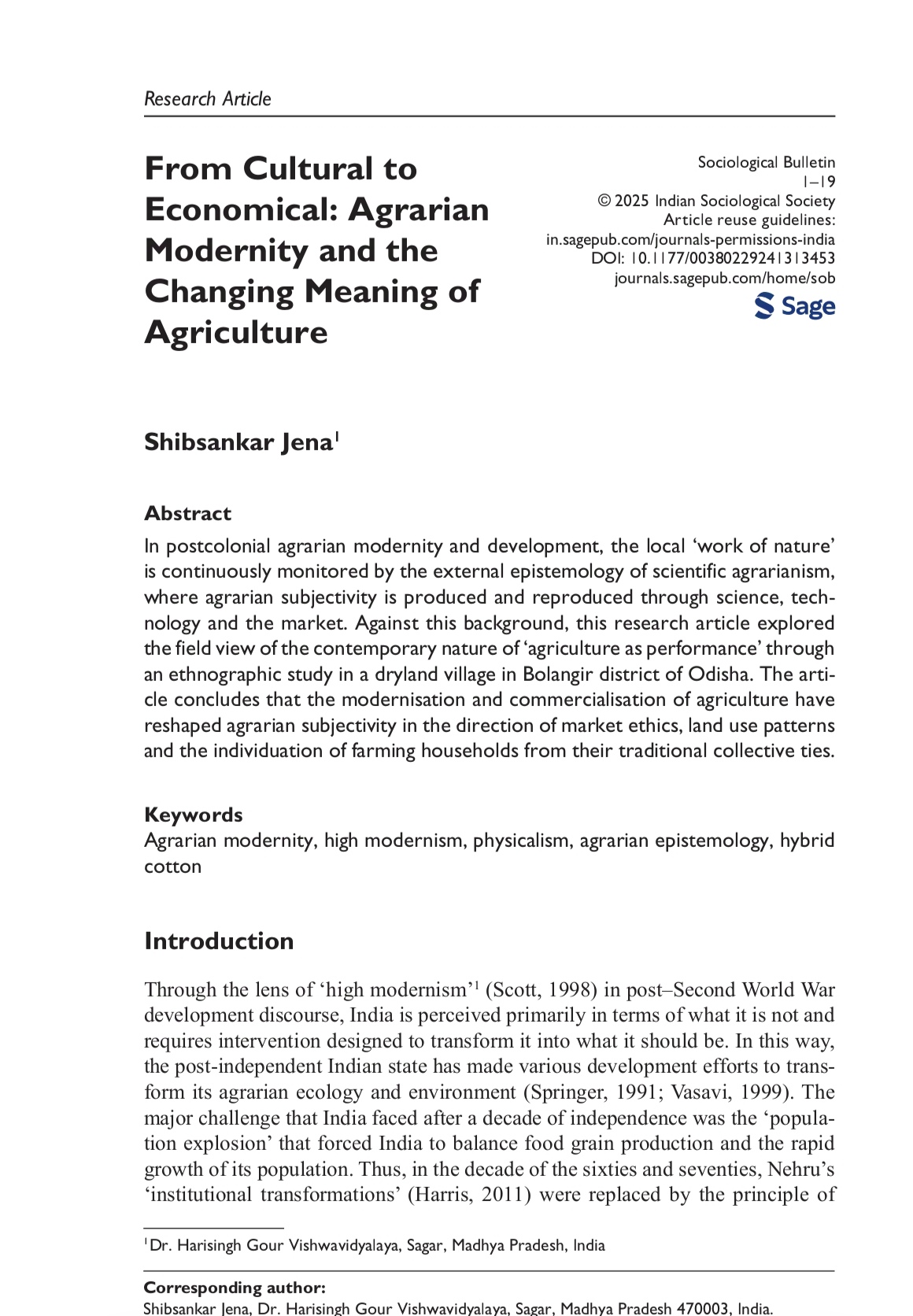 Dr. Shibsankar Jena | From cultural to economical: Agrarian Modernity and Changing meaning of agriculture | 2024 | Download |