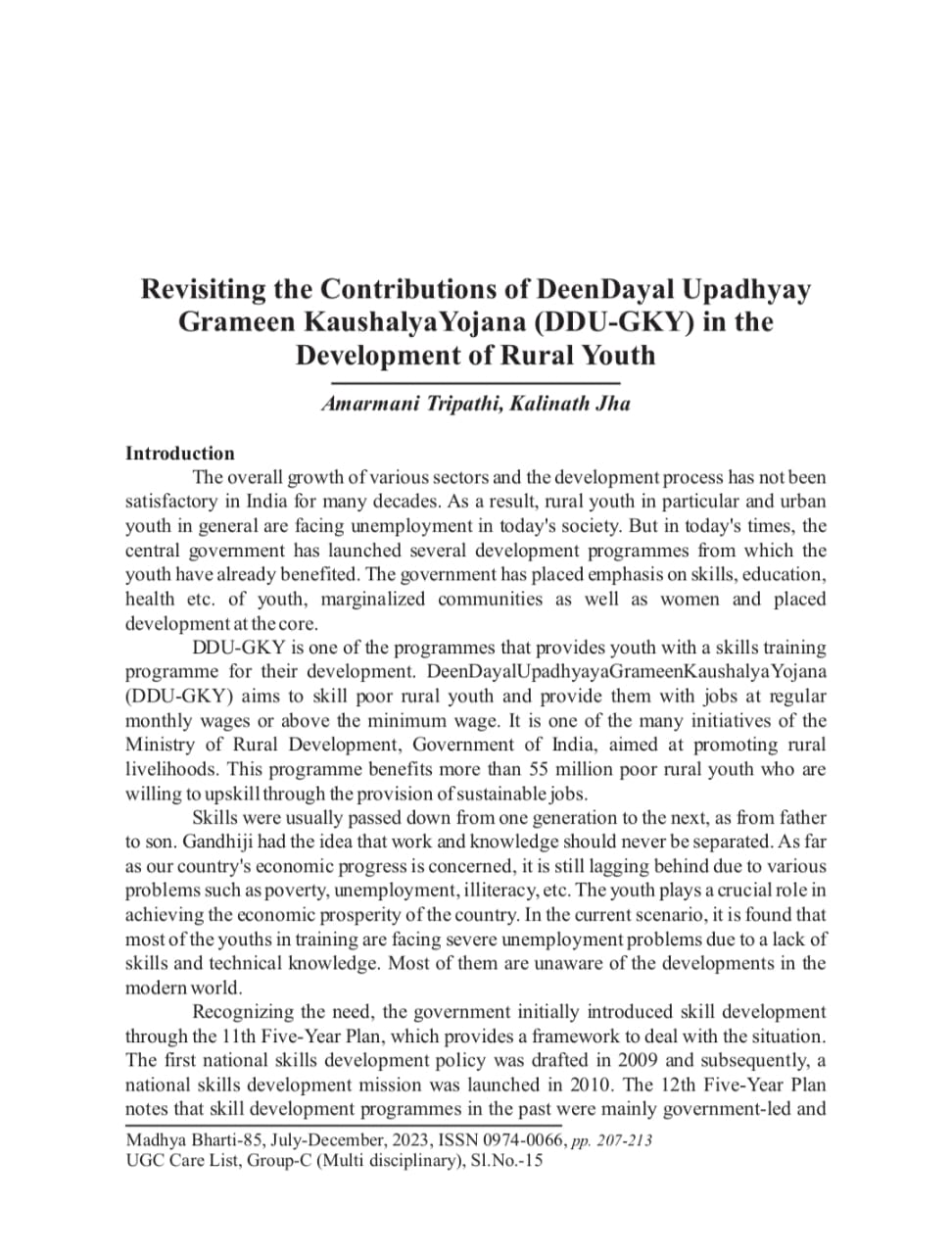 Prof. Kali Nath Jha & Amar Mani Tripathi | “Revisiting the contribution of Deen Dayal Upadhyay Grameen Kaushalya Yojana(DDU-GKY) in the Development of Rural Youth”.(Co-author) Madhyabharti 2024 | 2023 | Download |