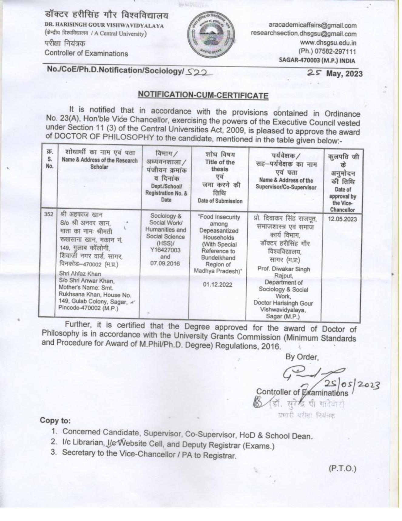 Ahfaz Khan | Y164270034 | MANF(SRF) | Food Insecurity among Depeasantised Households: A Study of Villages in Bundelkhand of Madhya Pradesh | Prof. D.S.Rajput | Download | |