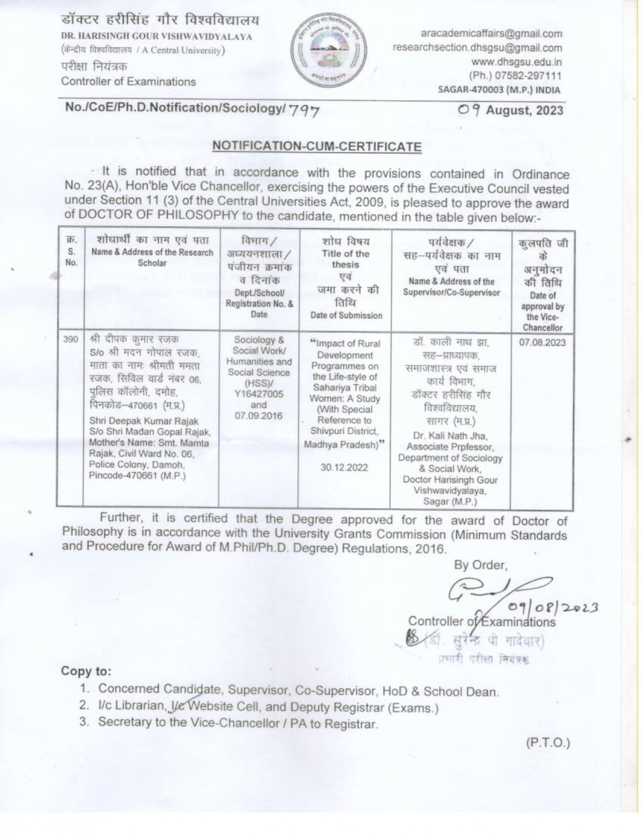 2023-24 | Deepak Kumar Rajak | Y164270054 | NET | Impact of Rural Development Programmes on Life Style of Sahariya Tribal Women (With Special Reference to Shivpuri District ) | Dr. Kali Nath Jha | Download |