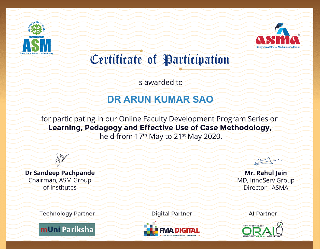2020 | Dr Arun Kumar Sao | Online FDP on Learning, Pedagogy and Effective Use of Case Methodology | 17.05.2020 to 21.05.2020 | Download |