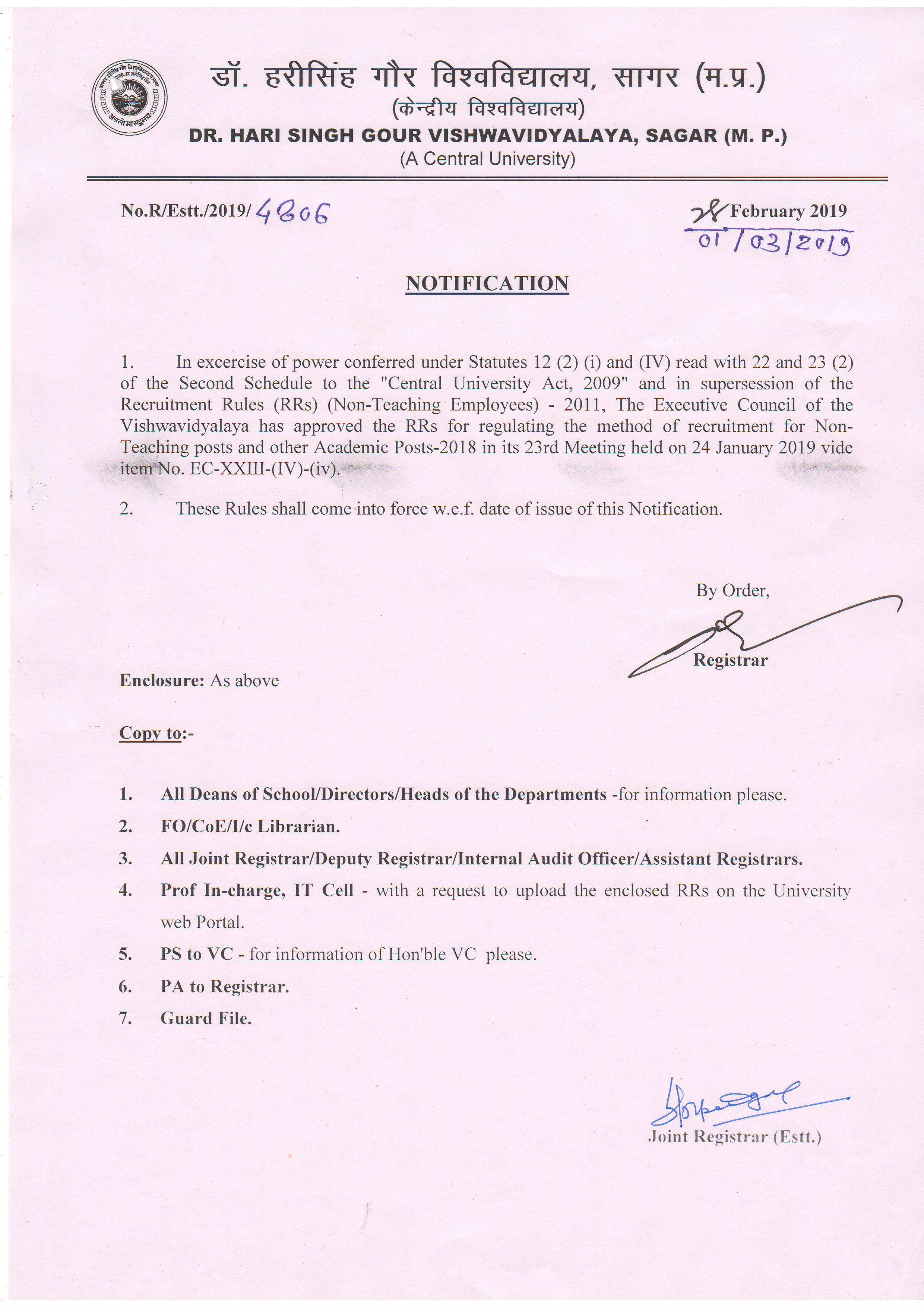 Recruitment Rules (RRS) (Non-Teaching Employees) – 2018 “Establishment Section”- (DispNo.R/Estt./2019/4806,Dt.01-03-2019) “पूर्ण जानकारी हेतु संलग्नक देखे”