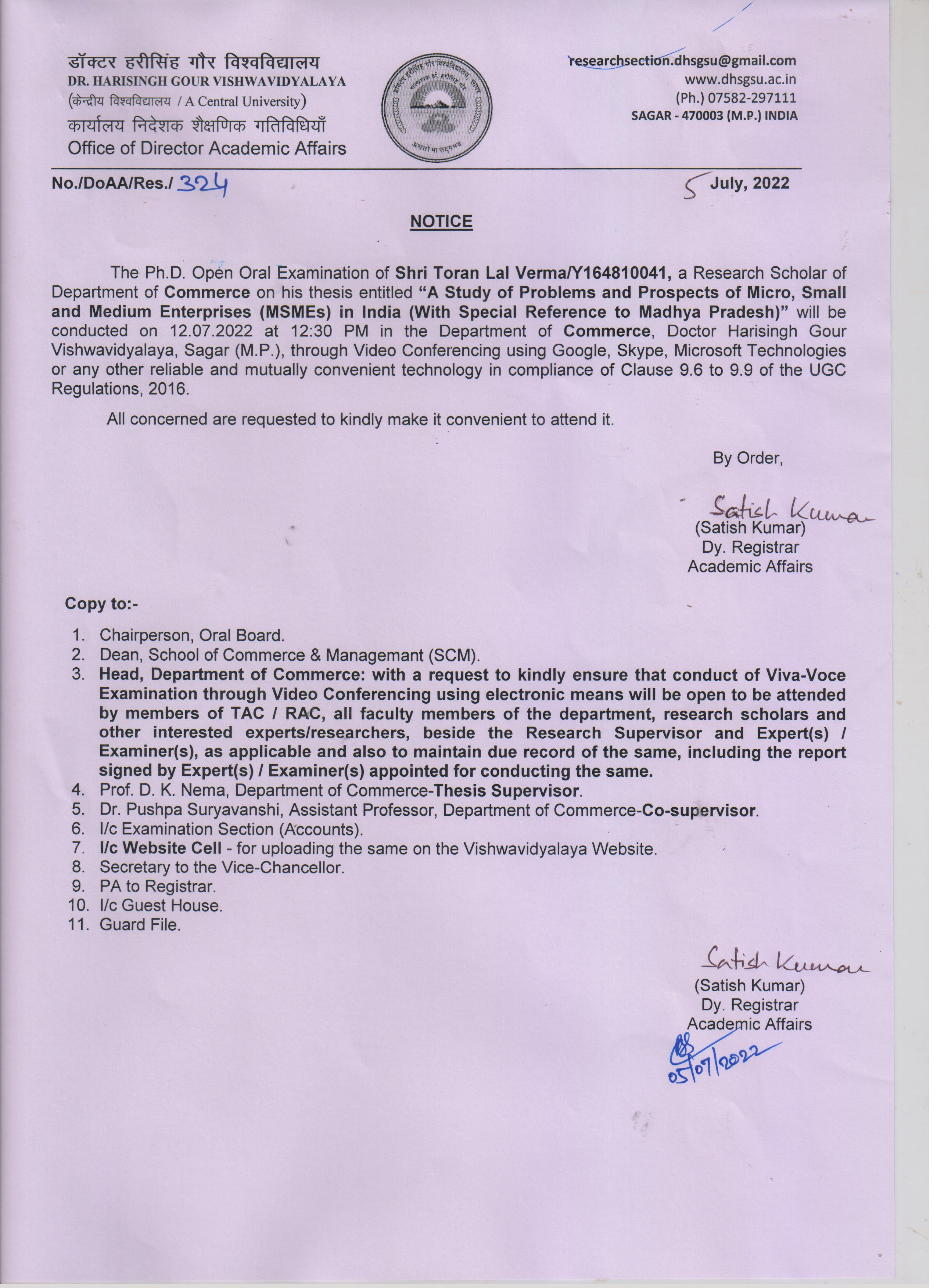 Notice: The Ph.D. Open Oral Examination of Shri Toran Lal Verma on 12-07-2022 Department of Commerce -(Research Section) -(by mail:DispNo. DoAA/Res/324,Dt.05-07-2022) पूर्ण जानकारी हेतु संलग्नक देखे