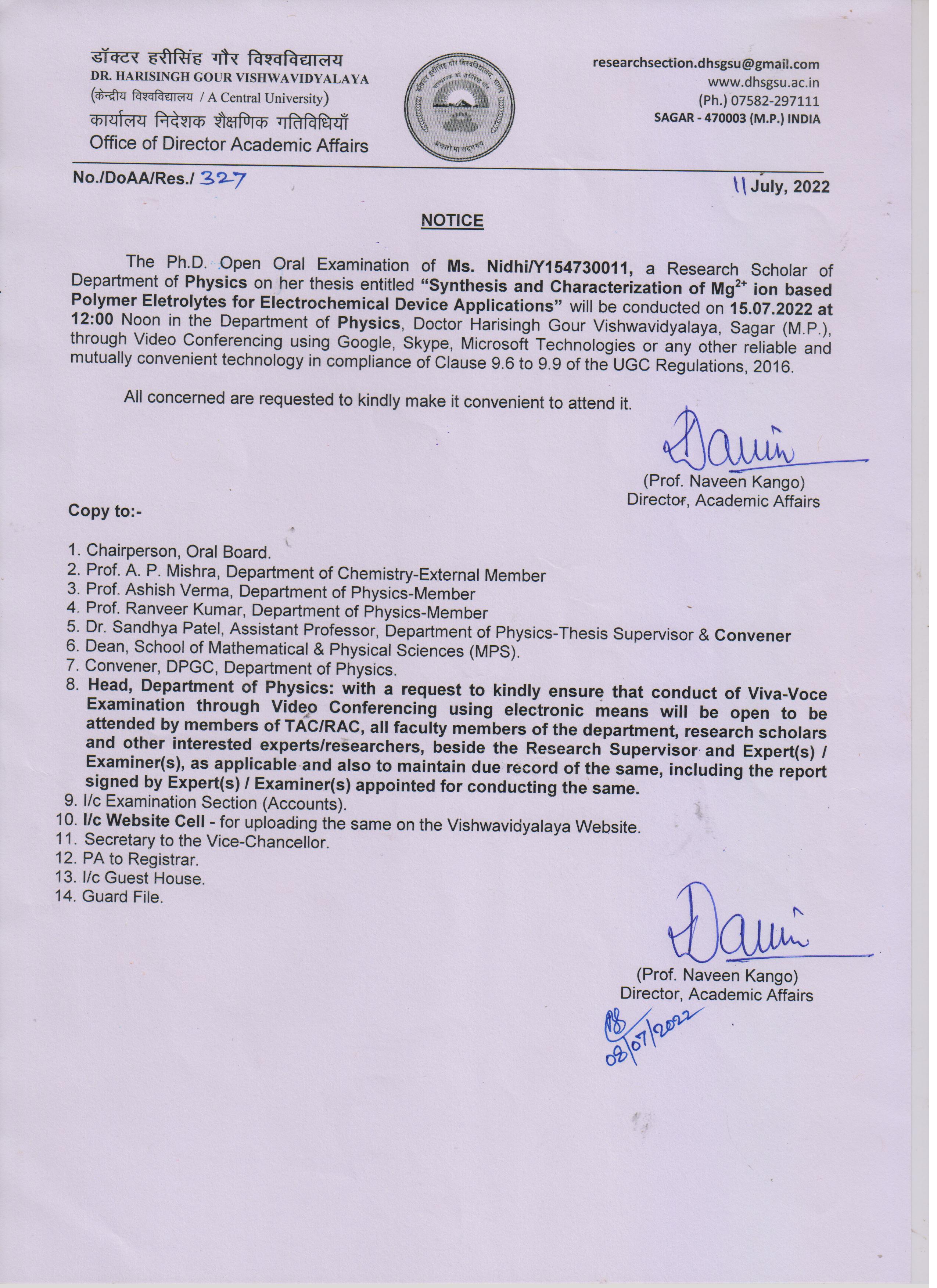 Notice: The Ph.D. Open Oral Examination of Ms. Nidhi on 15-07-2022 Department of Physics -Research Section- (DispNo. DoAA/Res/327,Dt.11.07.2022) पूर्ण जानकारी हेतु संलग्नक देखे