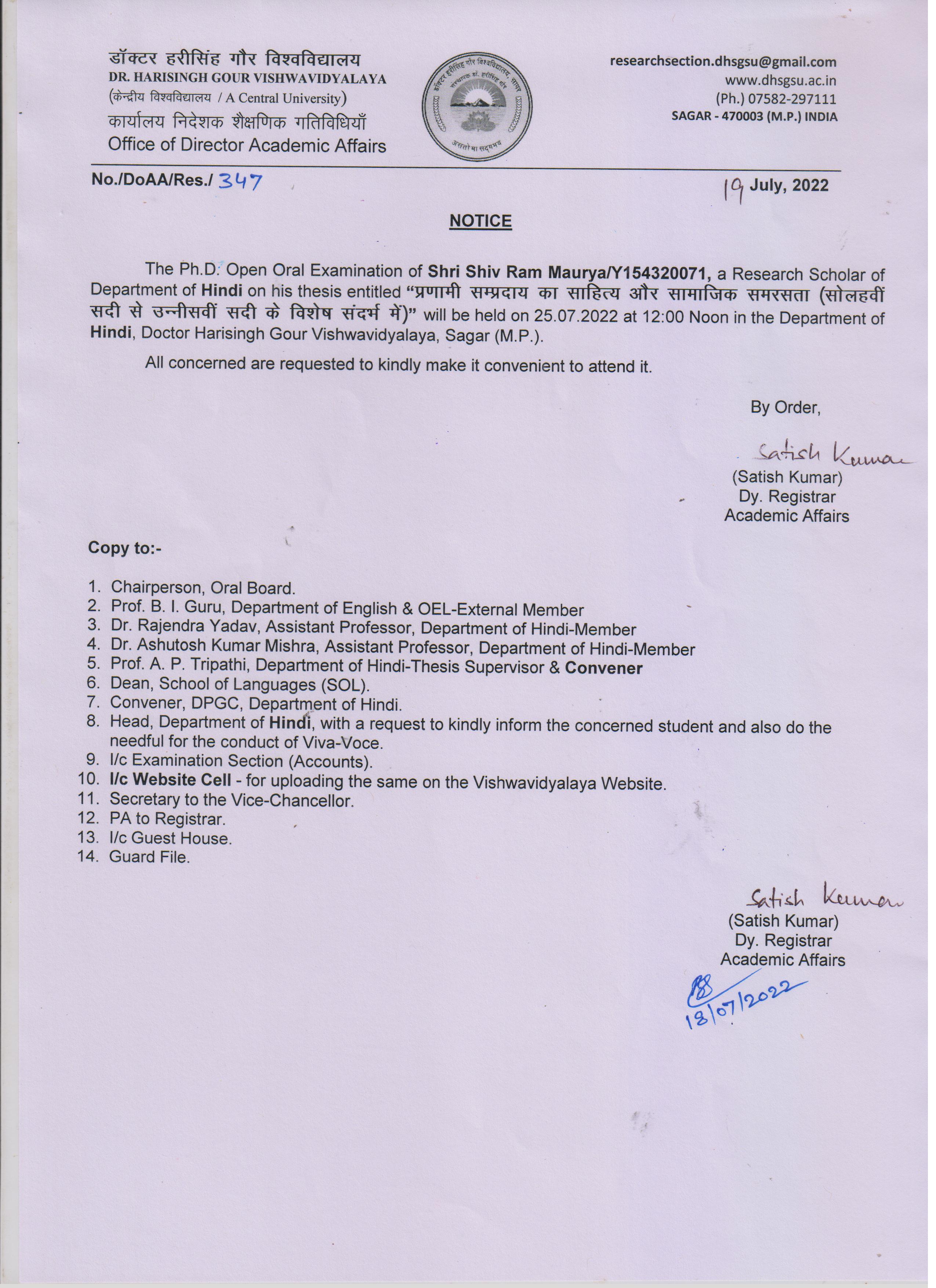 Notice: The Ph.D. Open Oral Examination of Shri Shiv Ram Maurya on 25-07-2022 Department of Hindi -Research Section- (DispNo. DoAA/Res./347,Dt.19-07-22) पूर्ण जानकारी हेतु संलग्नक देखे