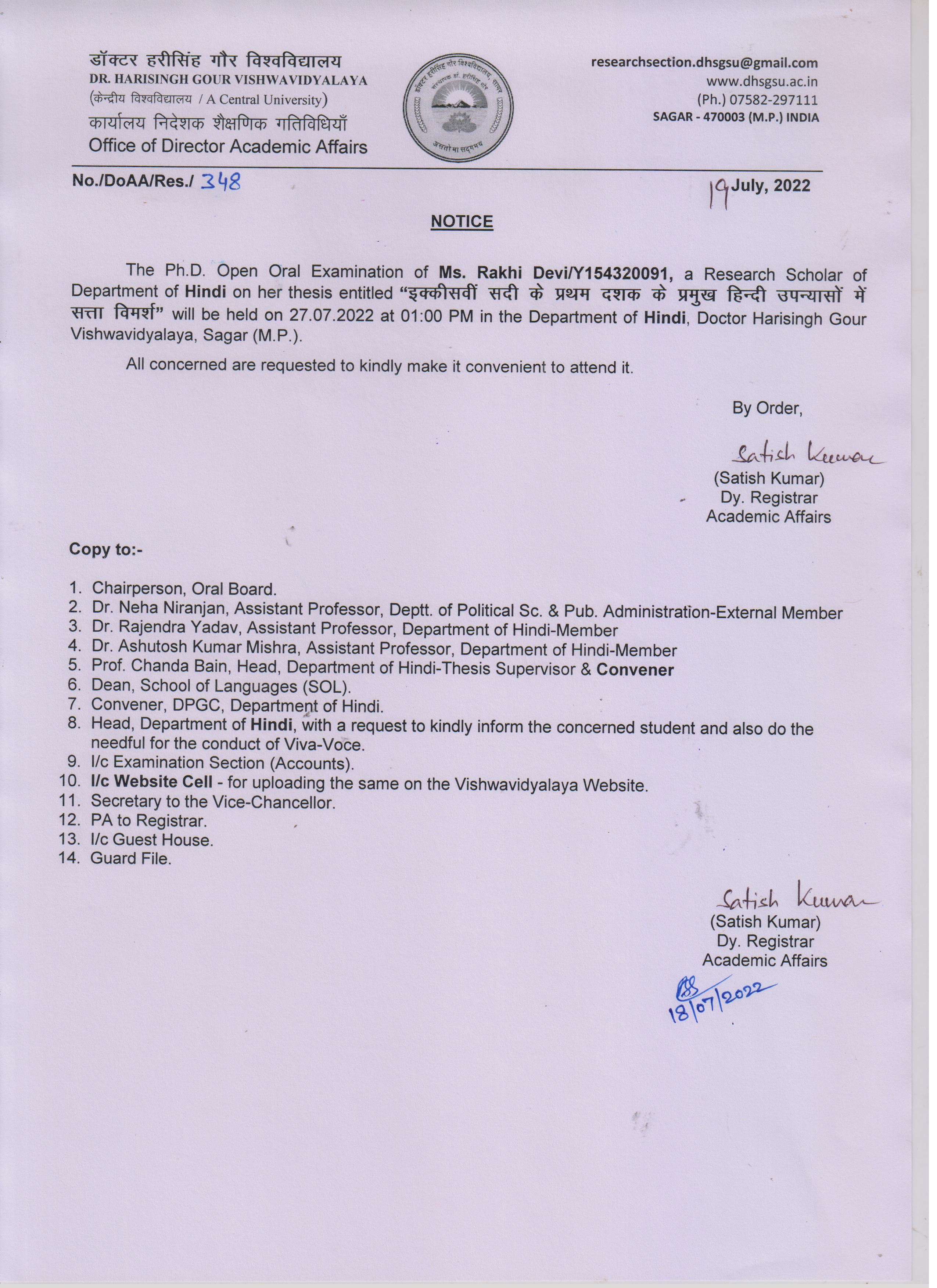 Notice: The Ph.D. Open Oral Examination of Ms. Rakhi Devi on 27-07-2022 Department of Hindi -Research Section- (DispNo. DoAA/Res./348,Dt.19-07-22) पूर्ण जानकारी हेतु संलग्नक देखे