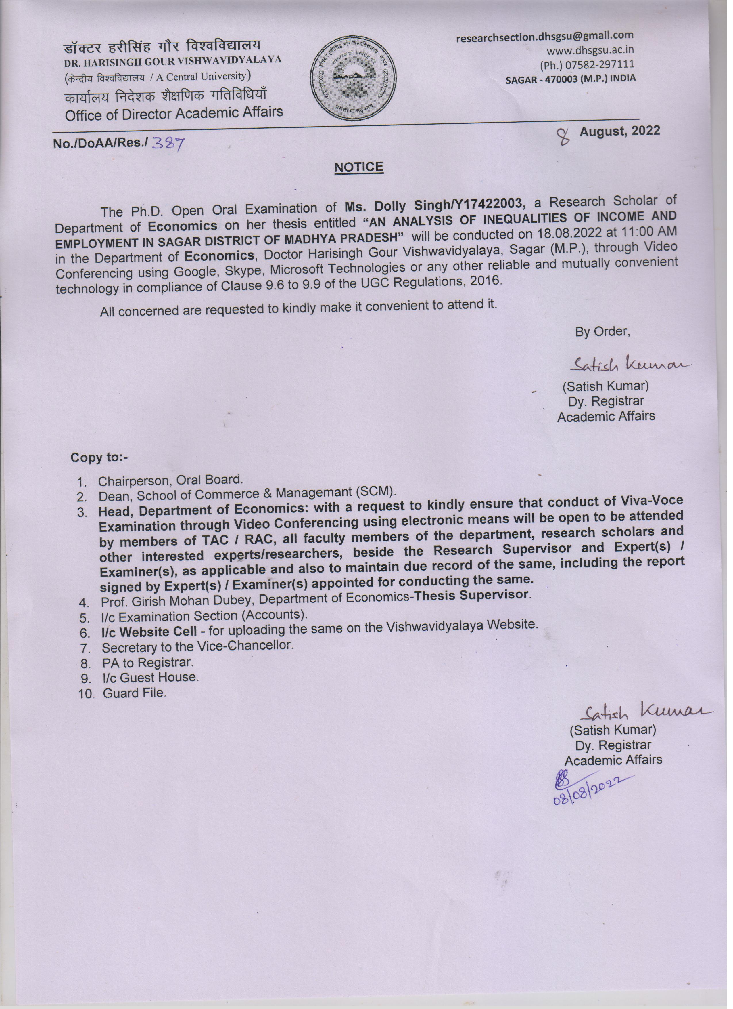 Notice: The Ph.D. Open Oral Examination of Ms. Dolly Singh on 18-08-2022 Department of Economics -Research Section- (DispNo. DoAA/Res./387,Dt.08-08-22) पूर्ण जानकारी हेतु संलग्नक देखे