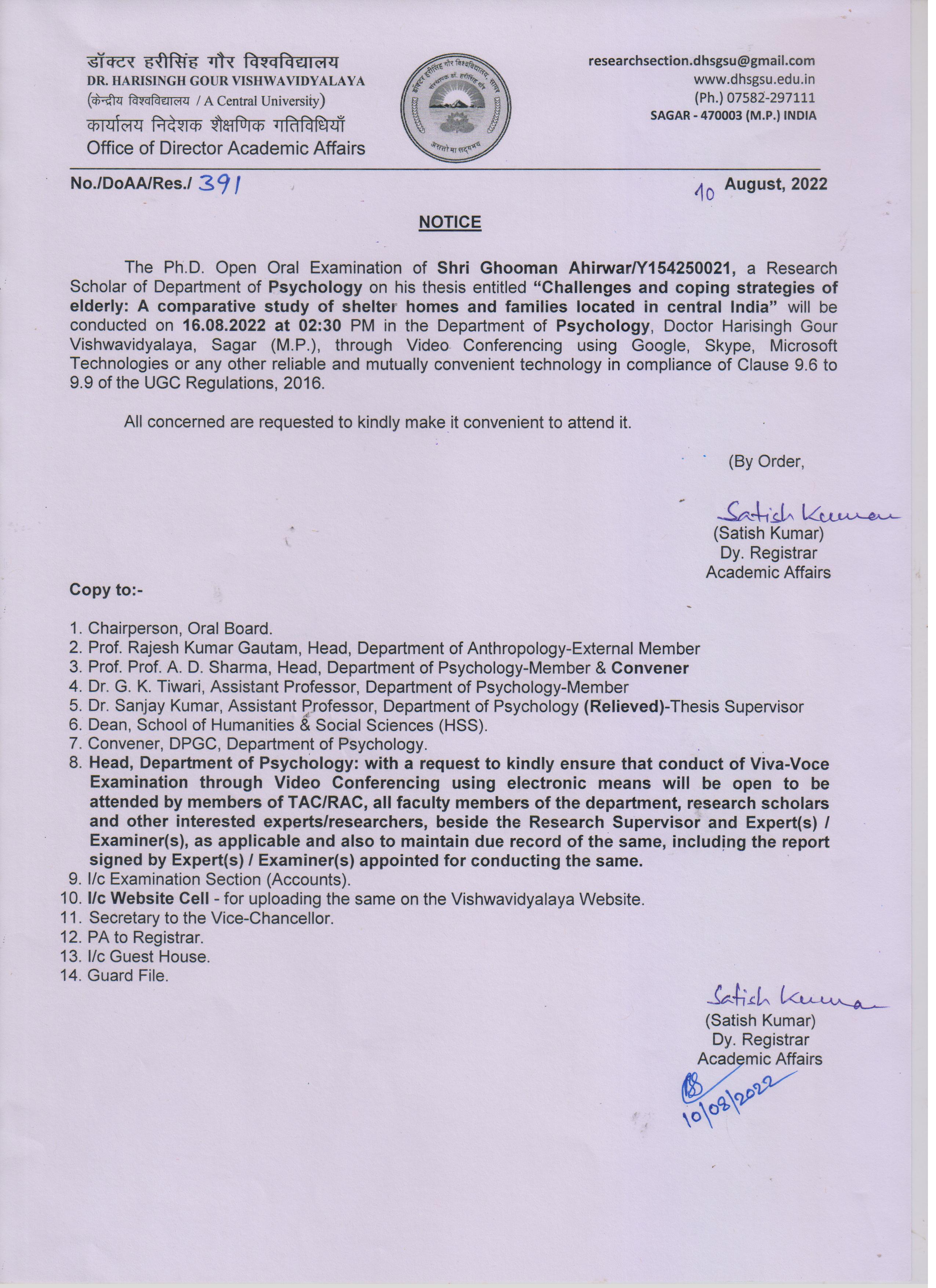 Notice: The Ph.D. Open Oral Examination of Shri Ghooman Ahirwar on 16-08-2022 Department of Psychology -Research Section- (DispNo. DoAA/Res./391,Dt.10-08-22) पूर्ण जानकारी हेतु संलग्नक देखे
