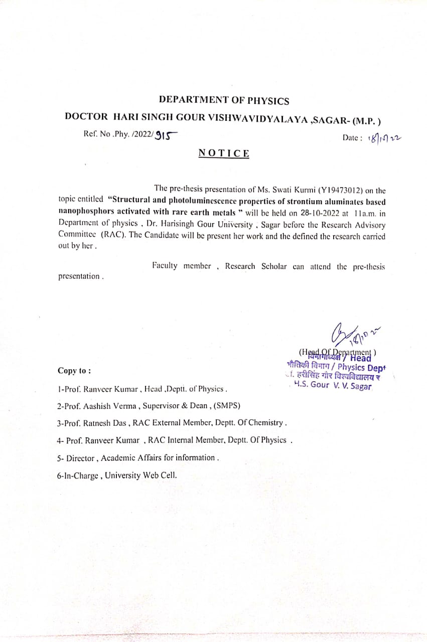 Notice: Pre Submission seminar of Ms. Swati Kurmi on 28-10-2022 Department of physics “Dept. Physics” -(DispNo. Phy./2022/915,Dt.18/21-10-22) पूर्ण जानकारी हेतु संलग्नक देखे