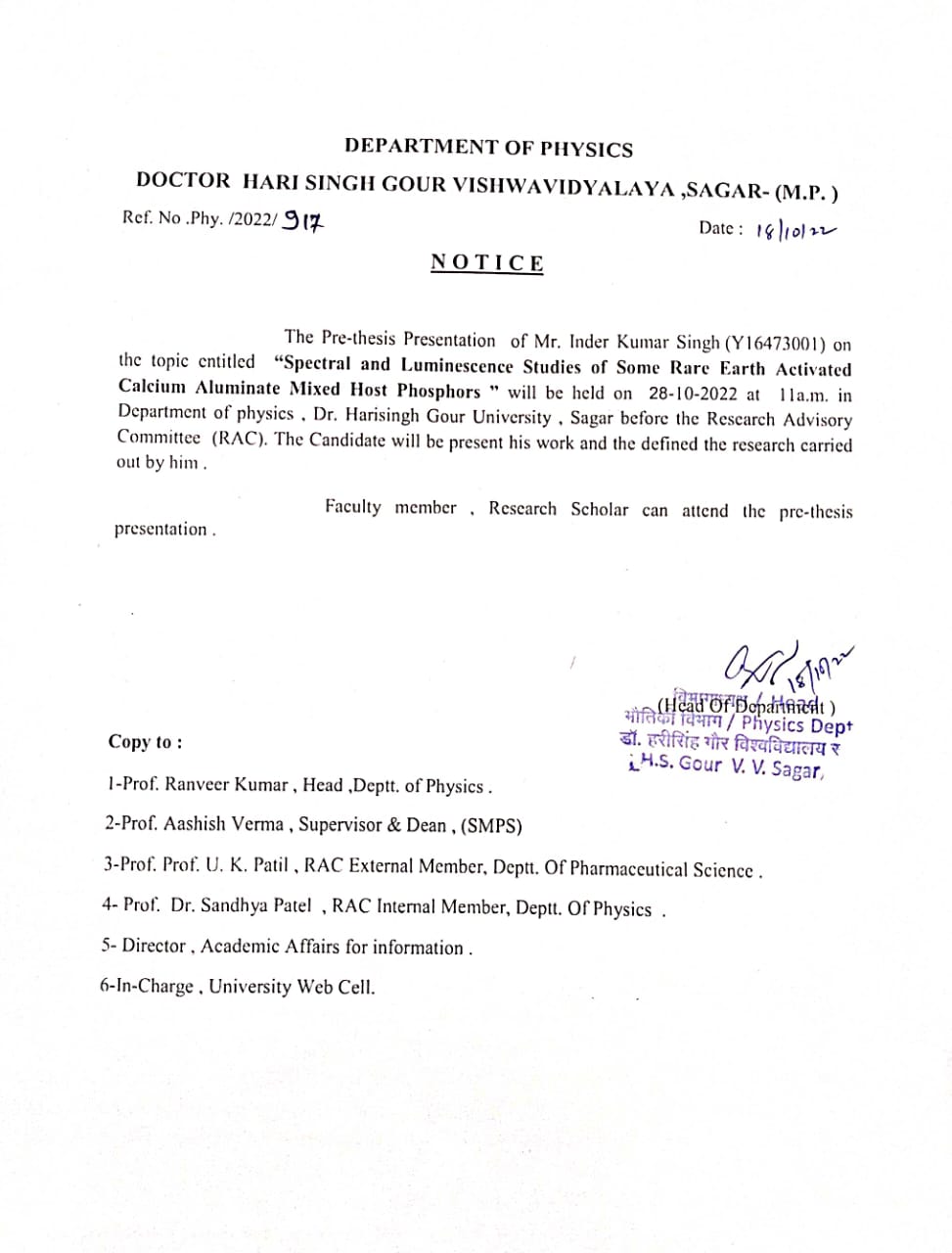 Notice: Pre Submission seminar of Mr. Inder Kumar Singh on 28-10-2022 Department of physics “Dept. Physics” -(DispNo. Phy./2022/917,Dt.18/21-10-22) पूर्ण जानकारी हेतु संलग्नक देखे