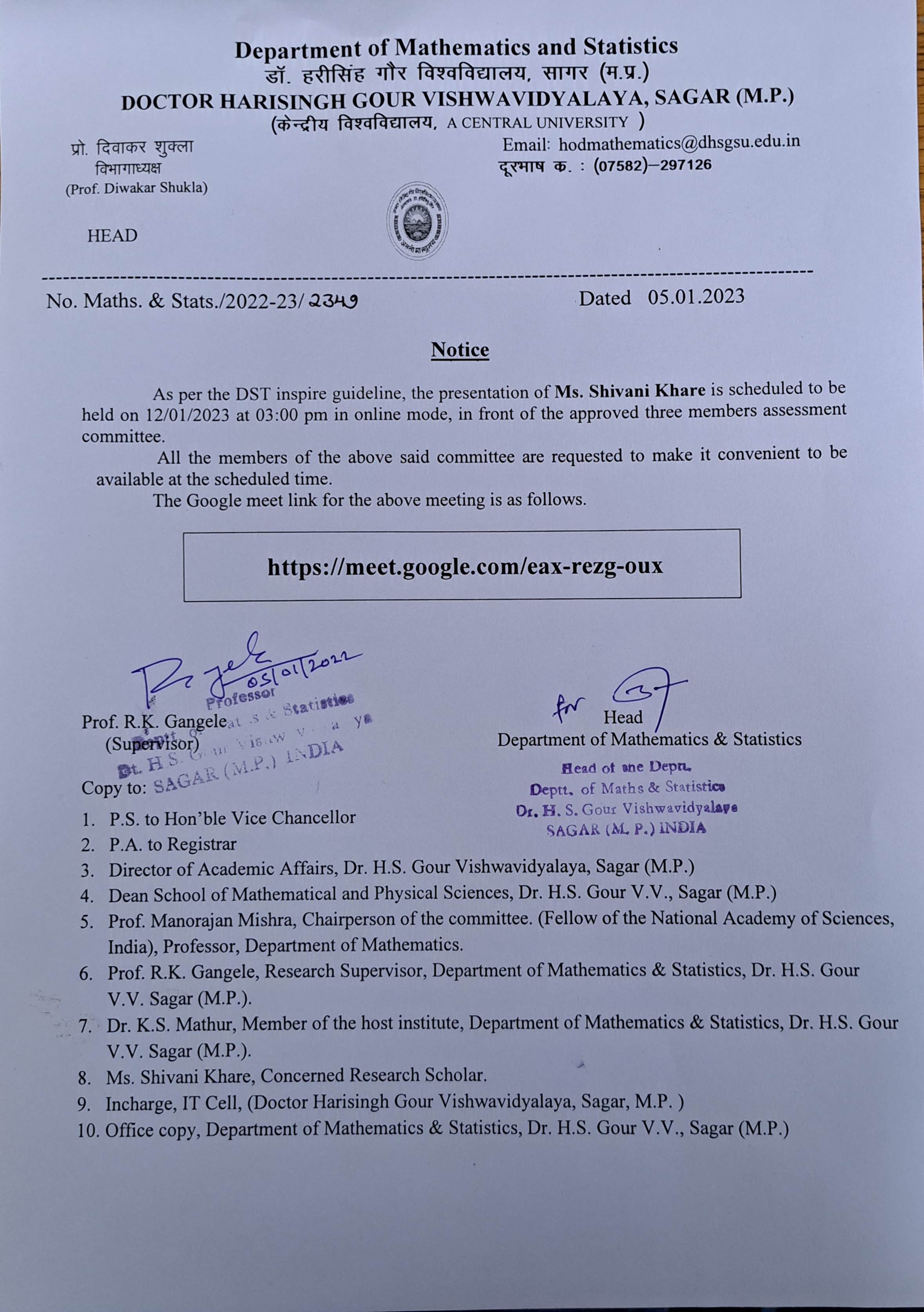 Notice: Presentation under DST inspire of Ms Shivani Khare for SRF “Dept.of Maths & stats” (DispNo.maths&stats./2022-23/2349,Dt.05-01-2023) पूर्ण जानकारी हेतु संलग्नक देखे