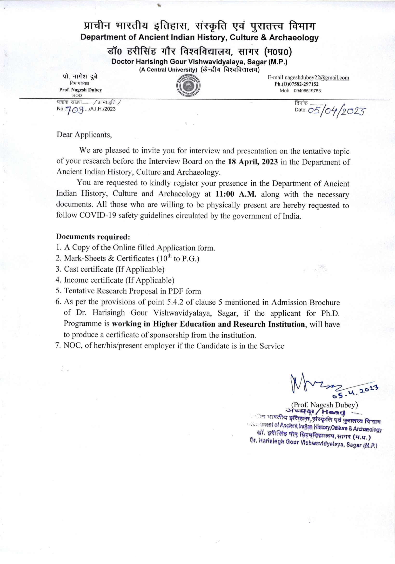 Information regarding Ph.D. Admission in the Department of AIH 2022-23 “Dept. A.I.H.” (Disp.No AIH/709,Dt.05-04-2023) पूर्ण जानकारी हेतु संलग्नक देखे