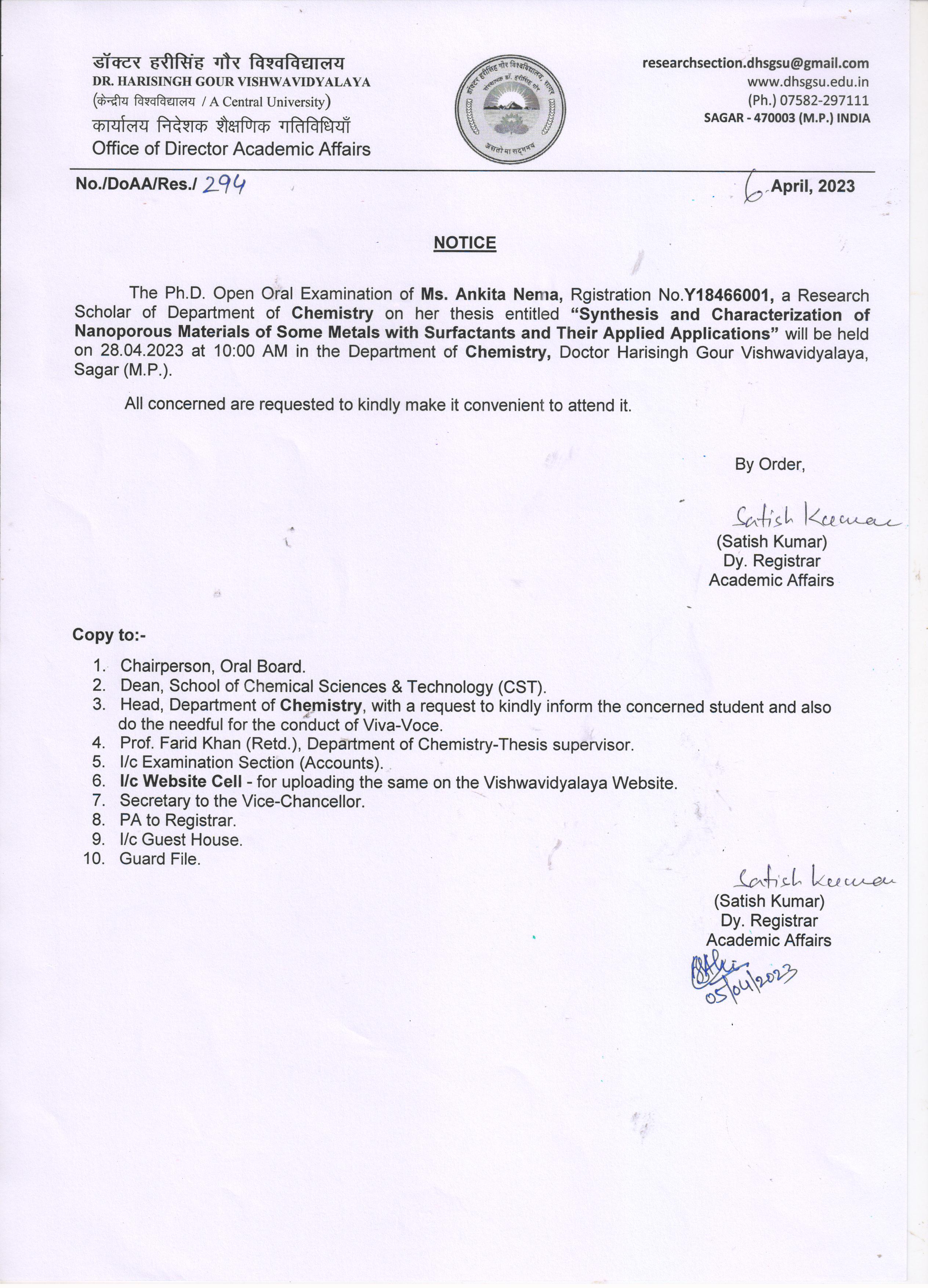 Notice: The Ph. D. Open Oral Examination of Ms. Ankita Nema on 28th April at 10 am (Friday) you all are cordially invited “Dept. Chemistry” (Disp.No. DoAA/Res/294,Dt. 06/26-04-2023) पूर्ण जानकारी हेतु संलग्नक देखे
