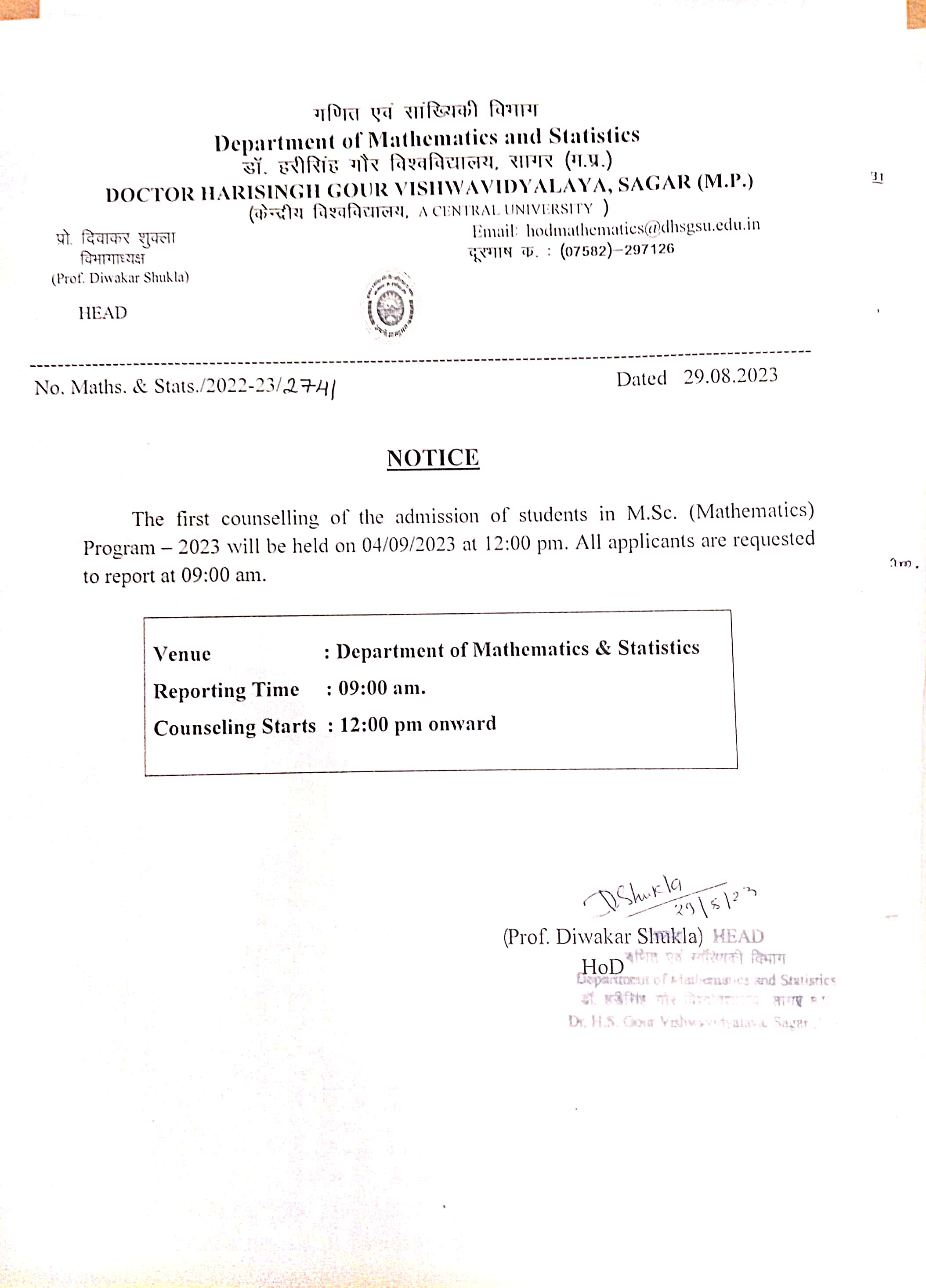 The first counselling of the admission of students in M.Sc. (Maths) Program-2023 “Dept. Math & Stats.” (DispNo. Math & stats./2022-23/2741,Dt. 29-08-2023) पूर्ण जानकारी हेतु संलग्नक देखे
