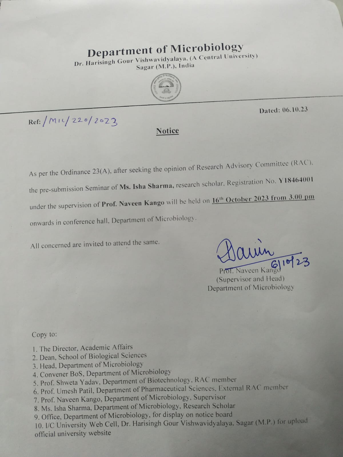 Notice: The Pre-submission seminar of Ms. Isha Sharma held on 16-10-2023 Department of Microbiology “Dept. Microbiology” (DispNo. Mic/220,Dt.06-10-2023) पूर्ण जानकारी हेतु संलग्नक देखे