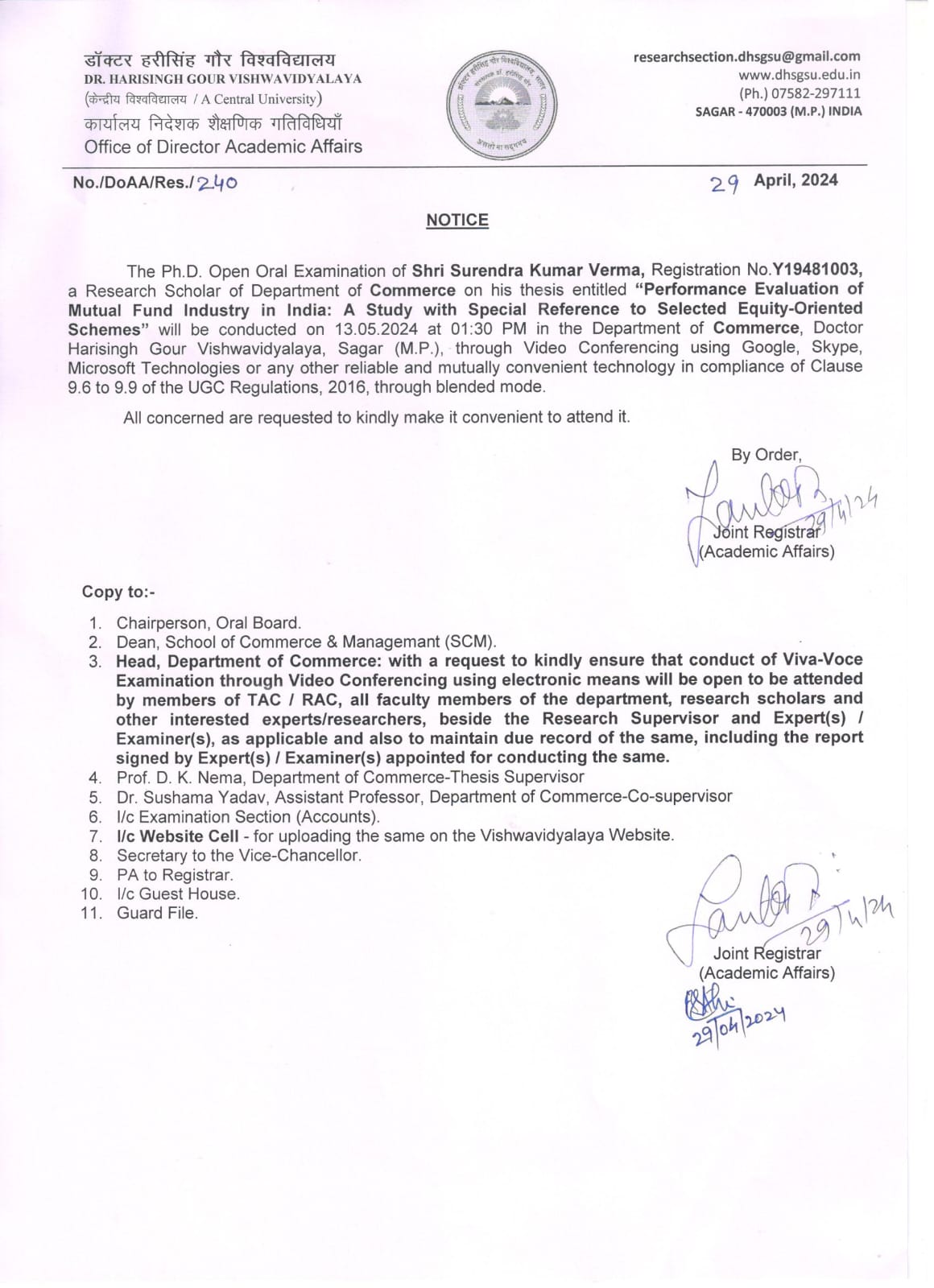 Notice: The Ph. D. open oral examination of Shri Surendra Kumar Verma on 13-05-2024 Department of Commerce “Dispatch Section” (DispNo. DoAA/Res/240, Dt. 29-04-2024) पूर्ण जानकारी हेतु संलग्नक देखे