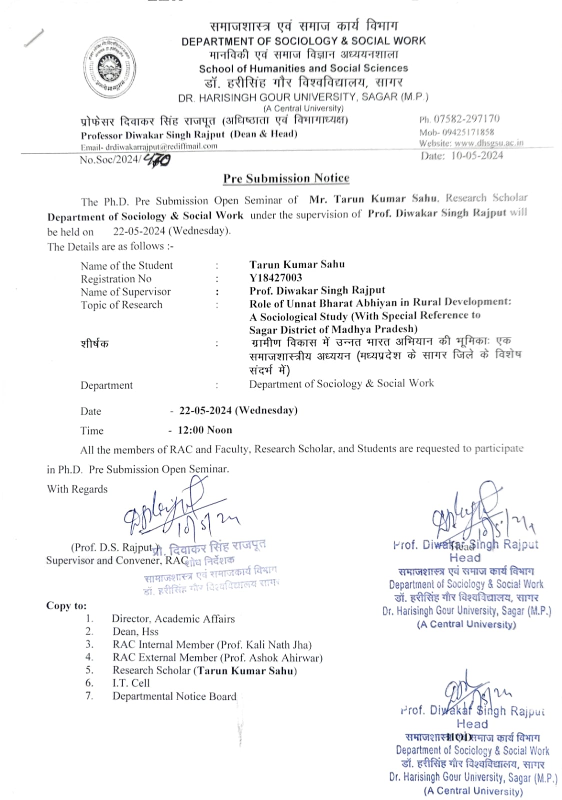 Notice: Pre- submission Seminar of Mr. Tarun Kumar Sahu on 22-05-2024 Department of Sociology & Social Work “Dept. Sociology” (DispNo.Soc/2024/470, Dt.10-05-2024) पूर्ण जानकारी हेतु संलग्नक देखे