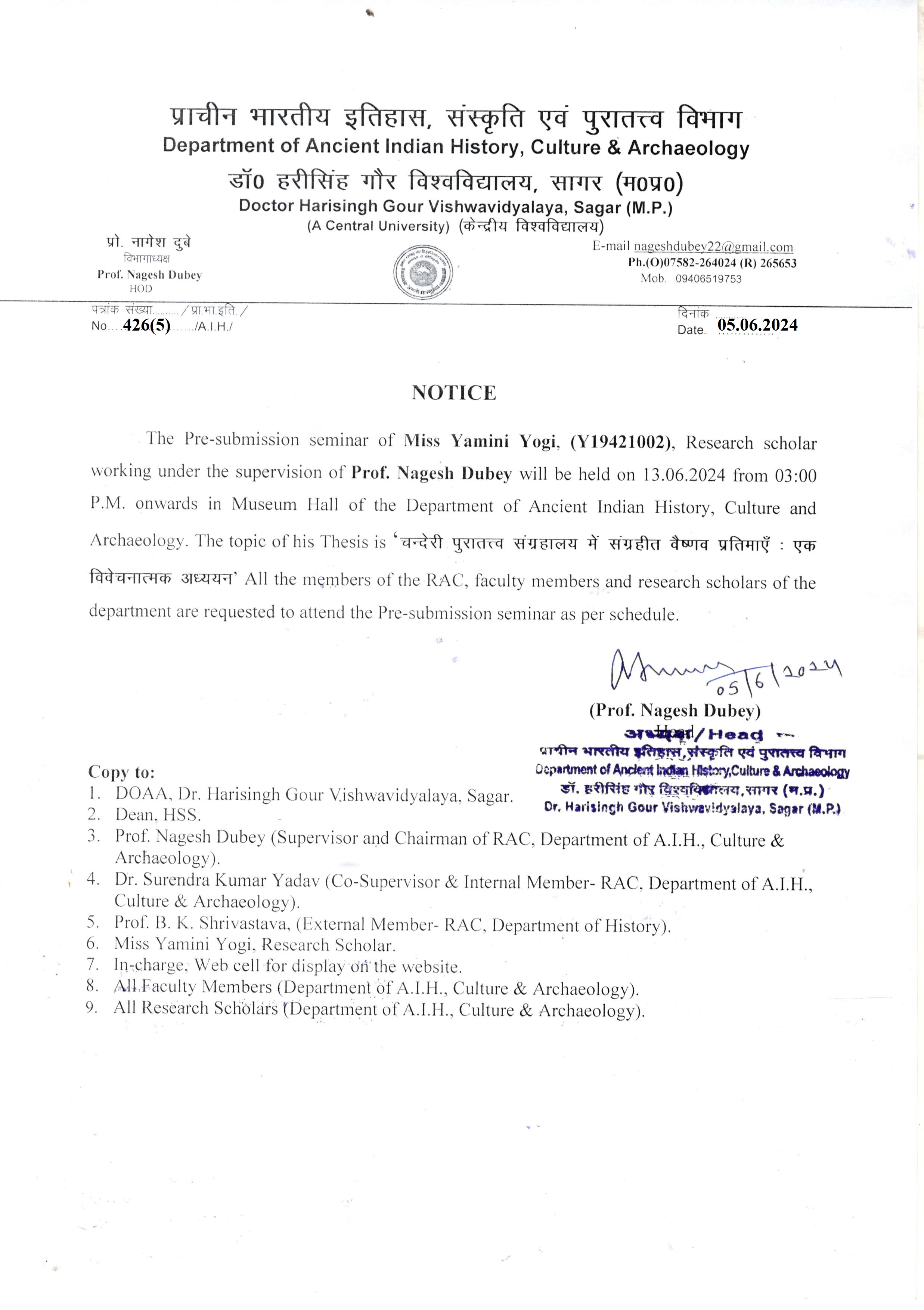 Notice: Pre-submission Seminar of Miss. Yamini Yogi on 13-06-2024 Department of Ancient Indian History “Dept. AIH” (DispNo.426(5)/AIH/2024, Dt.05-06-2024) पूर्ण जानकारी हेतु संलग्नक देखे