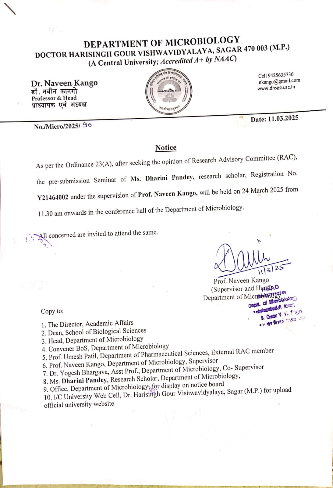 Notice: Pre-Submission Seminar of Mr. Dharini Pandey, Registration No.Y21464002 on 24/03-2025 Department of Microbiology “Dept. Microbiology” (DispNo Micro./2025/90, Dt.11/17-03-2025) पूर्ण जानकारी हेतु संलग्नक देखे
