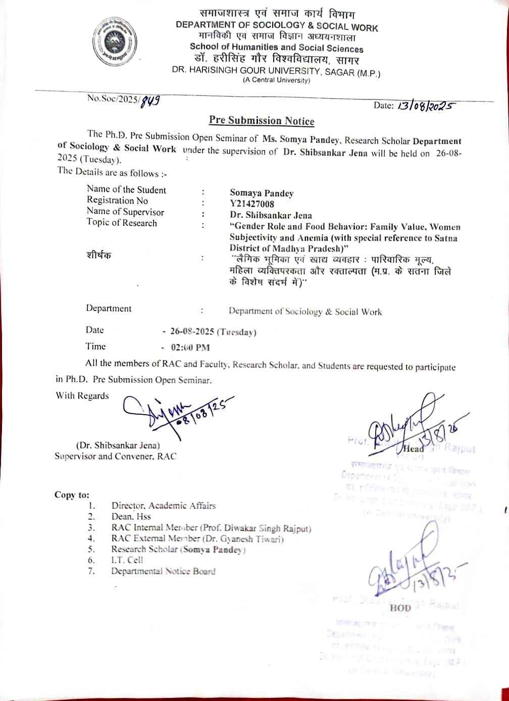 Notice: The Ph.D. Pre-Submission Open Seminar of Ms. Somya Pandey on 26-08-2025 Department of Sociology and Social Work “Dept. Sociology" "Disp.No. soc/2025/849, Dt.13-08-2025" पूर्ण जानकारी हेतु संलग्नक देखे