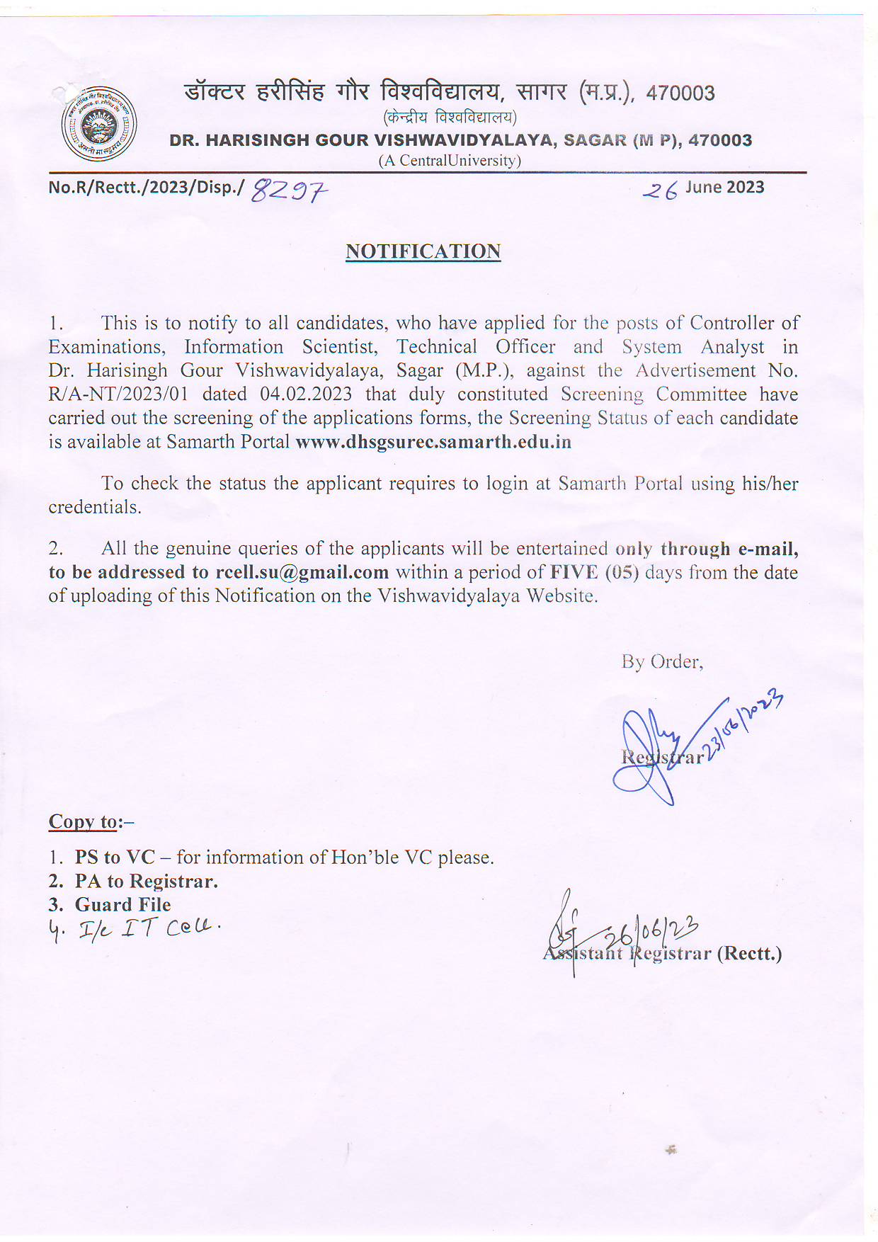 Notification: Screening Committee Recommendation for the Post of Controller of Examination Information Scientist, Technical officer and System Analyst “Recruitment cell” (DispNo.Rectt./2023/Disp./8297,Dt.26-06-2023) पूर्ण जानकारी हेतु संलग्नक देखे
