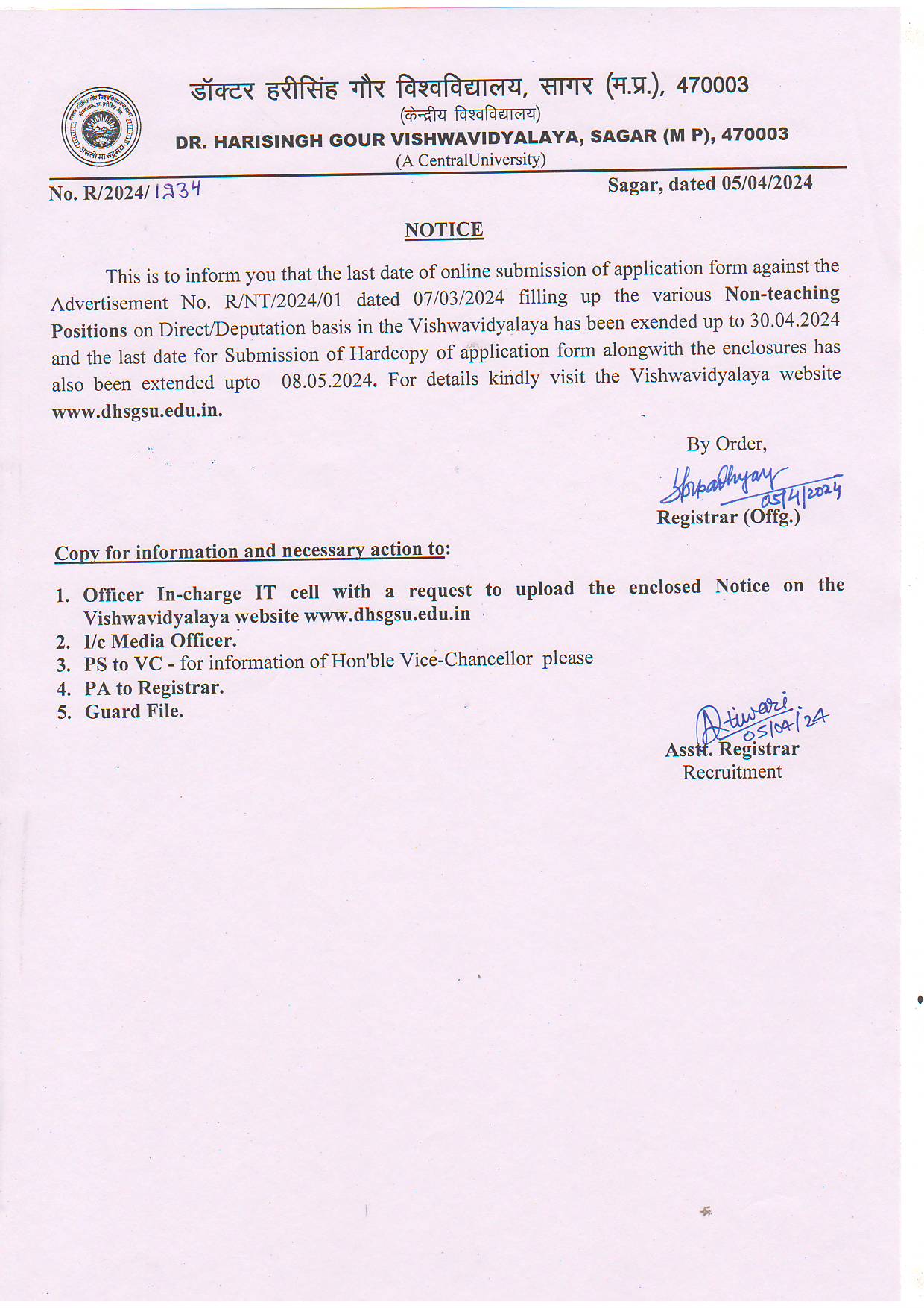 Notice: Regarding Extension the last Date of Application for Non-teaching Recruitment Advertisement No. R/NT/2024/01 Date 07/03/2024.