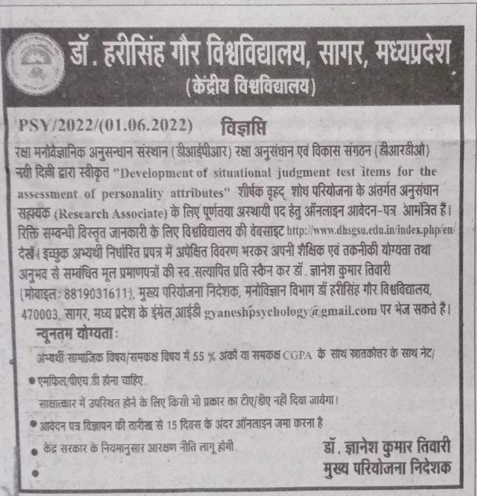 Advertisement for the position of Research Associate in a project of (DIPRCDRDO) Delhi
