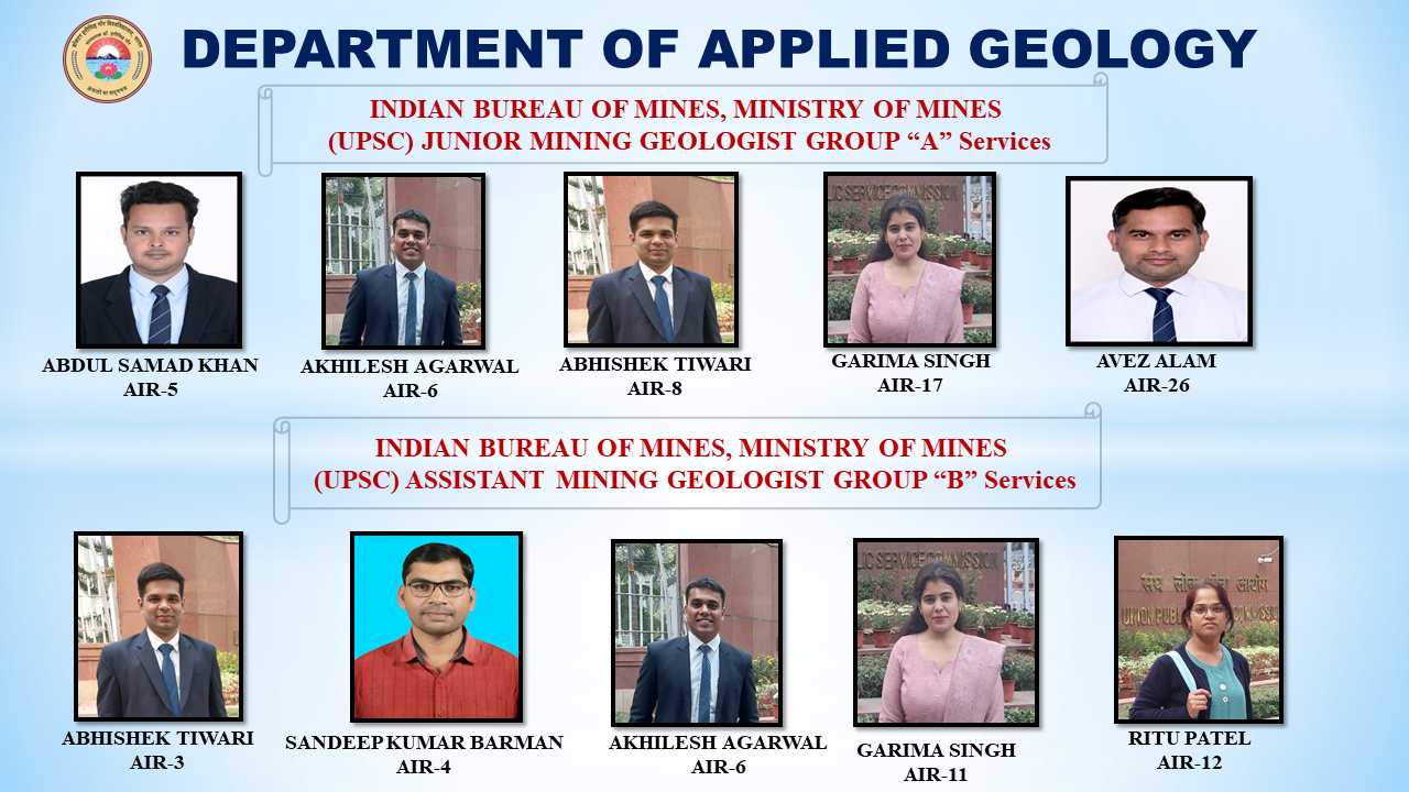 Department have a good track record for placement. Specially in GSI and Central Ground Water Board (Group B Services) conducted by UPSC New Delhi every year.