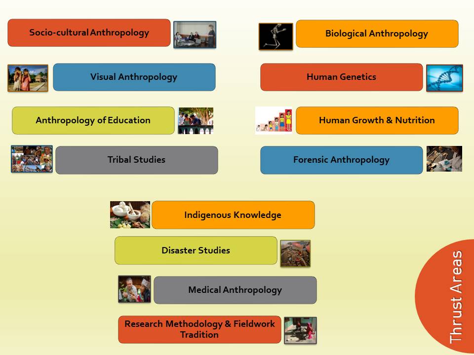 The major thrust areas of the department are Socio-cultural anthropology and Physical/Biological anthropology. The scholars of Socio-cultural anthropology study the ethnographies of rural, tribal, and urban societies with an eye to understand the changing dimensions of culture and society. Other researches on this area are focused on Indigenous Knowledge, Anthropology of Education, Visual Anthropology, and Tribal Studies focusing on the issue of development. The second major thrust area is Physical/Biological anthropology, researches are conducted on Human Genetics, Growth and Nutrition, Forensic Anthropology. In addition to this, the sub-fields such as Medical Anthropology, Disaster Studies, and Archaeological Anthropology combine both socio-cultural and biological perspectives and at enumerable points, it requires the intrusion of data and theory from each other. One of the main focuses of these thrust areas is research methodology and fieldwork tradition, and the students of the department are given field exposure through one month of rigorous fieldwork in the remote tribal areas.