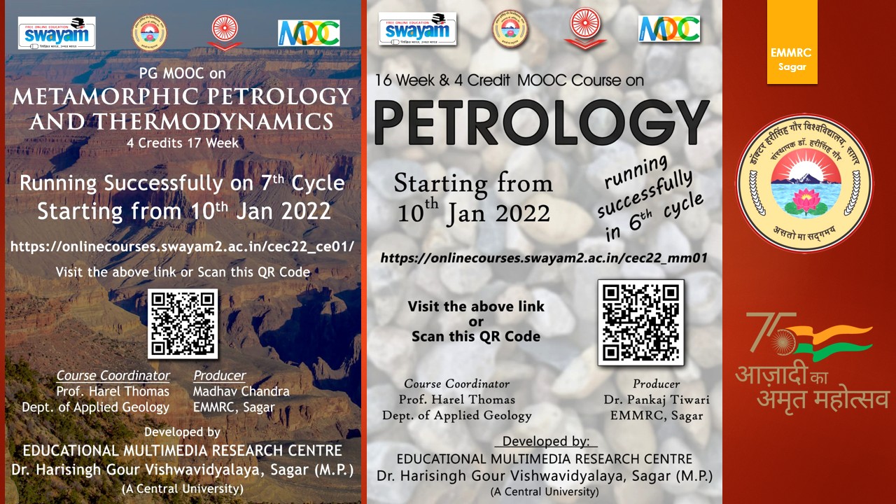 Department of Applied Geology Offered 09 MOOCs for SWAYAM plateform which are running regularly since November, 2016 on words. Among them few course are very popular within and outside India, especially Metamorphic Petrology & Thermodynamics and Petrology.